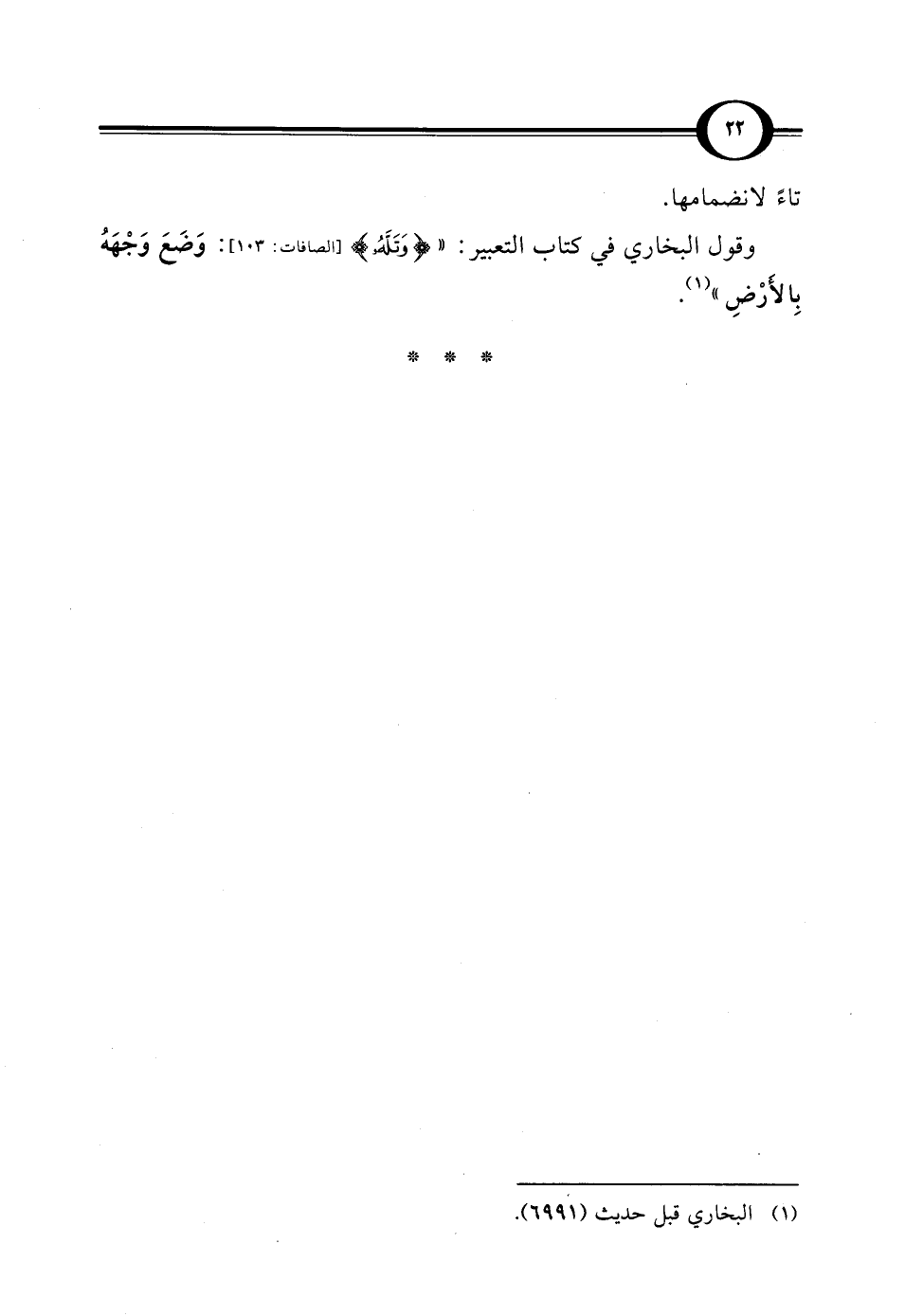 تاءً لانضمامها. وقول البخاري في كتاب التعبير: " {وَتَلَّهُ} [الصافات: 103]: وَضَعَ وَجْهَهُ بِالأَرْضِ" (¬1).