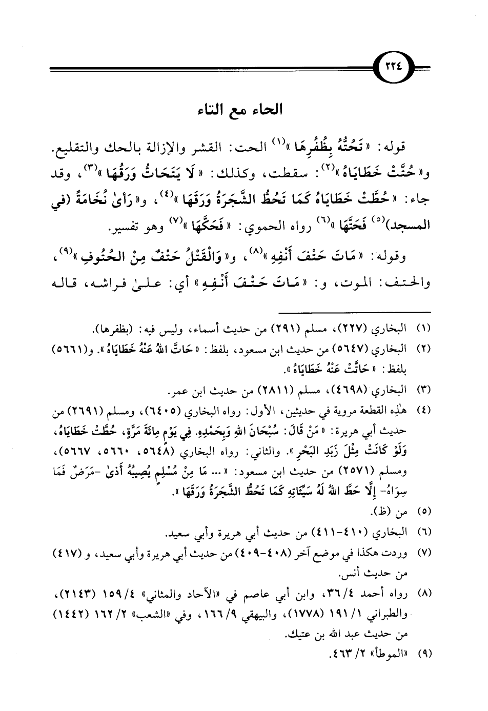و"حُتَّتْ خَطَايَاهُ" (¬2): سقطت، وكذلك: "لَا يَتَحَاتُّ وَرَقُهَا" (¬3)، وقد جاء: "حُطَّتْ خَطَايَاهُ كَمَا تَحُطُّ الشَّجَرَةُ وَرَقَهَا" (¬4)، و"رَأى نُخَامَةً (في المسجد) (¬5) فَحَتَّهَا" (¬6) رواه الحموي: "فَحَكَّهَا" (¬7) وهو تفسير.
