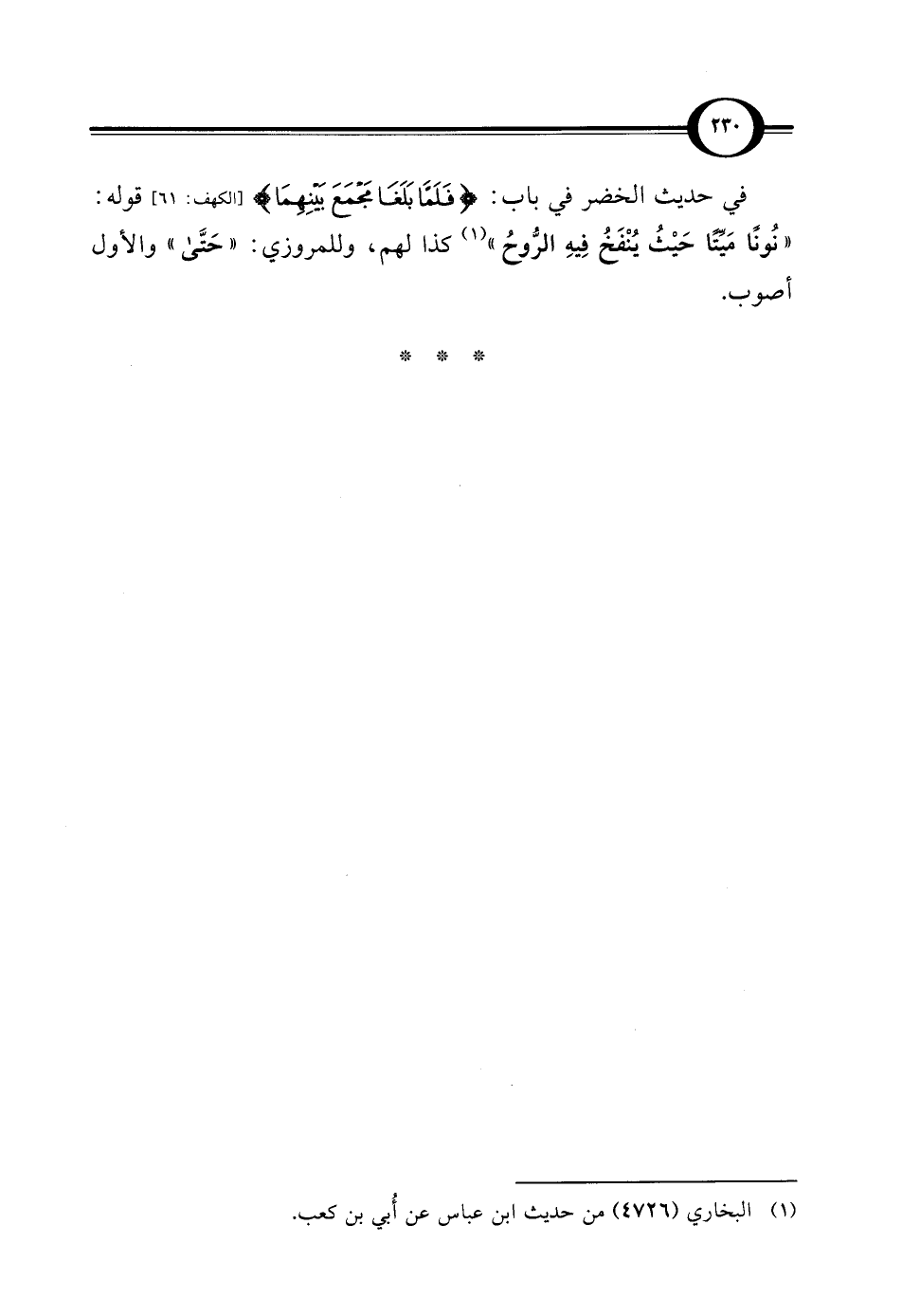 في حديث الخضر في باب: {فَلَمَّا بَلَغَا مَجْمَعَ بَيْنِهِمَا} [الكهف: 61]، قوله: "نُونًا مَيِّتًا حَيْثُ يُنْفَخ فِيهِ الرُّوحُ" (¬1) كذا لهم، وللمروزي: "حَتَّى" والأول أصوب.