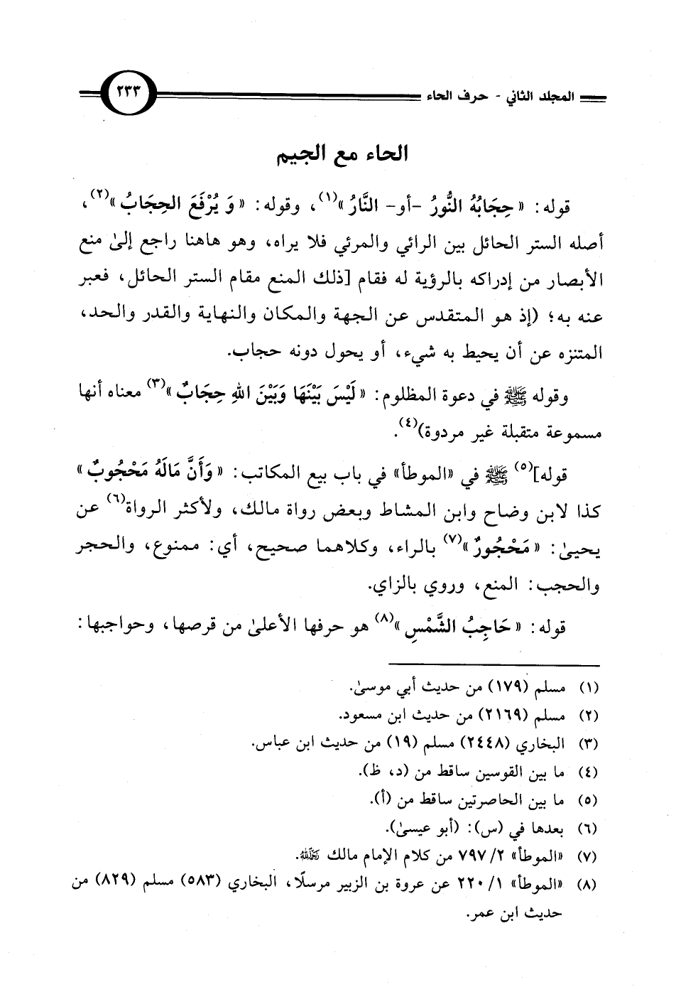 قوله: "حِجَابُهُ النُّورُ- أو- النَّارُ" (¬1)، وقوله: "وَيُرْفَعَ الحِجَابُ" (¬2)، أصله الستر الحائل بين الرائي والمرئي فلا يراه، وهو هاهنا راجع إلى منع الأبصار من إدراكه بالرؤية له فقام [ذلك المنع مقام الستر الحائل، فعبر عنه به؛ (إذ هو المتقدس عن الجهة والمكان والنهاية والقدر والحد، المتنزه عن أن يحيط به شيء، أو يحول دونه حجاب.