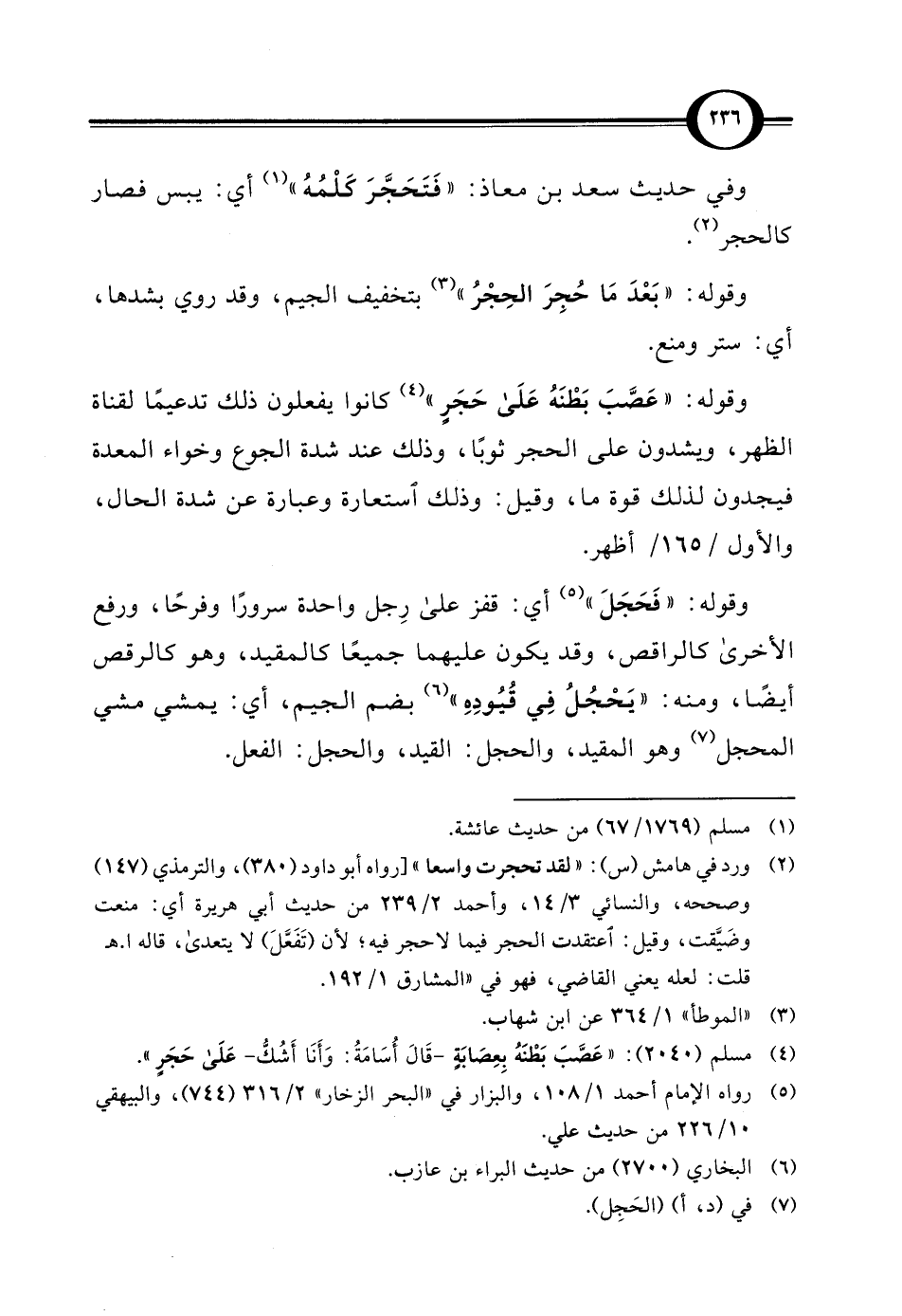 (¬2) ورد في هامش (س): "لقد تحجرت واسعا" [رواه أبو داود (380)، والترمذي (147) وصححه، والنسائي 3/ 14، وأحمد 2/ 239 من حديث أبي هريرة أي: منعت وضَيَّقت، وقيل: اعتقدت الحجر فيما لا حجر فيه؛ لأن (تَفَعَّلَ) لا يتعدى، قاله ا. هـ قلت: لعله يعني القاضي، فهو في "المشارق 1/ 192.