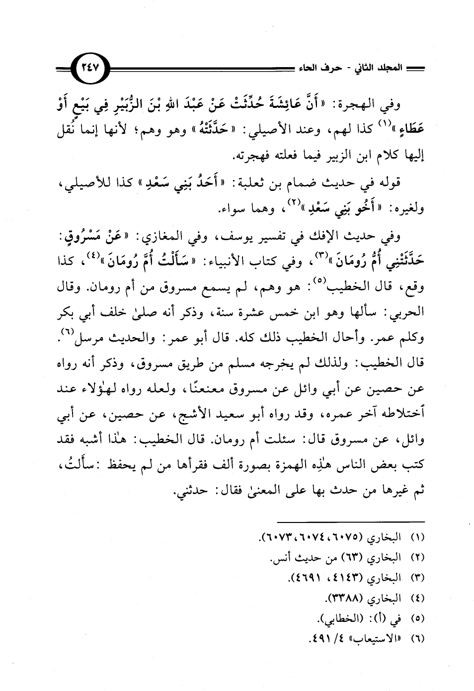 وفي حديث الإفك في تفسير يوسف، وفي المغازي: "عَنْ مَسْرُوقٍ: حَدَّثَتْنِي أُمُّ رُومَانَ" (¬3)، وفي كتاب الأنبياء: "سَأَلْتُ أُمَّ رُومَانَ" (¬4)، كذا وقع، قال الخطيب (¬5): هو وهم، لم يسمع مسروق من أم رومان. وقال الحربي: سألها وهو ابن خمس عشرة سنة، وذكر أنه صلى خلف أبي بكر وكلم عمر. وأحال الخطيب ذلك كله. قال أبو عمر: والحديث مرسل (¬6).