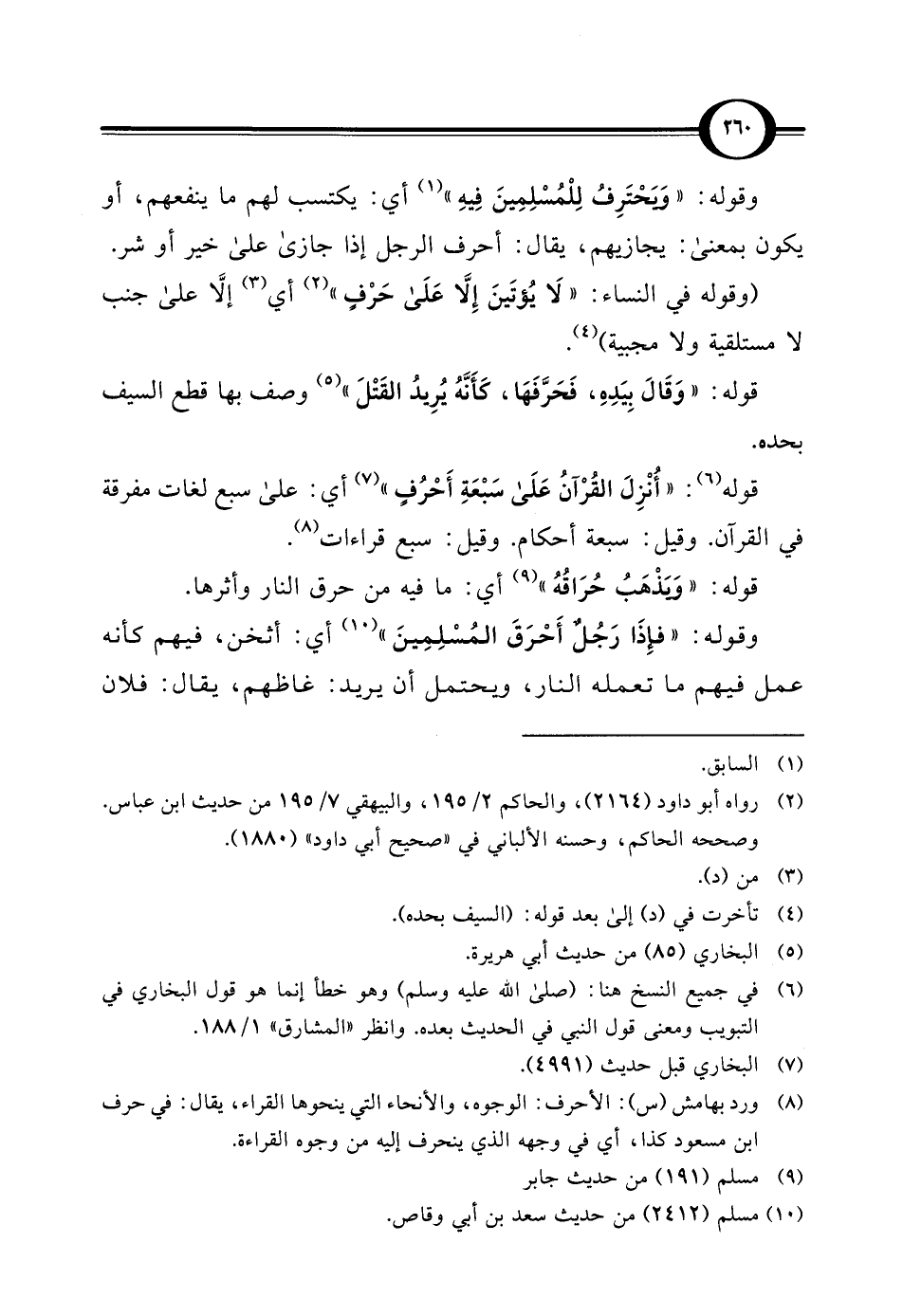 (¬8) ورد بهامش (س): الأحرف: الوجوه، والأنحاء التي ينحوها القراء، يقال: في حرف ابن مسعود كذا، أي في وجهه الذي ينحرف إليه من وجوه القراءة.