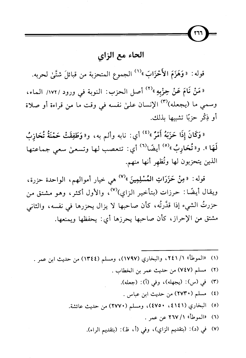 "وَكَانَ إِذَا حَزَبَهُ أَمْرٌ" (¬4) أي: نابه وألم به، و"وَطَفِقَتْ حَمْنَةُ تُحَازِبُ لَهَا". و"تُحَارِبُ" (¬5) أيضًا (¬6) أي: تتعصب لها وتسعى سعي جماعتها الذين يتحزبون لها وتُظهِر أنها منهم.