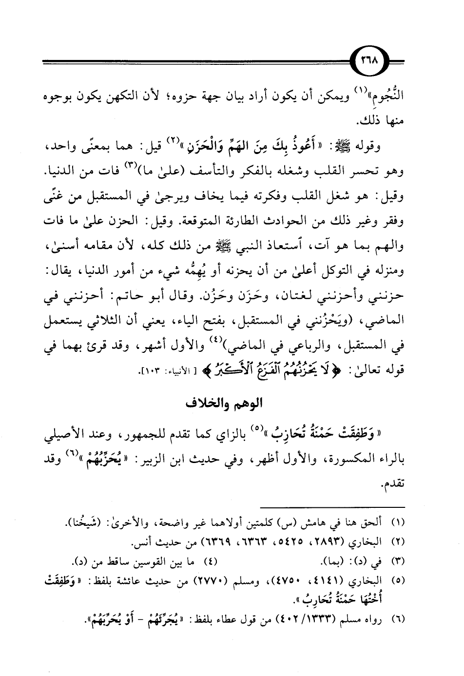 وقيل: هو شغل القلب وفكرته فيما يخاف ويرجى في المستقبل من غنًى وفقر وغير ذلك من الحوادث الطارئة المتوقعة. وقيل: الحزن على ما فات والهم بما هو آت، استعاذ النبي - صلى الله عليه وسلم - من ذلك كله, لأن مقامه أسنى، ومنزله في التوكل أعلى من أن يحزنه أو يُهِمُّه شيء من أمور الدنيا، يقال: حزنني وأحزنني لغتان، وحَزَن وحَزُن. وقال أبو حاتم: أحزنني في الماضي، (وَيحْزُنني في المستقبل، بفتح الياء، يعني أن الثلاثي يستعمل في المستقبل، والرباعي في الماضي) (¬4) والأول أشهر، وقد قرئ بهما في قوله تعالى: {لَا يَحْزُنُهُمُ الْفَزَعُ} [الأنبياء؛ 103].