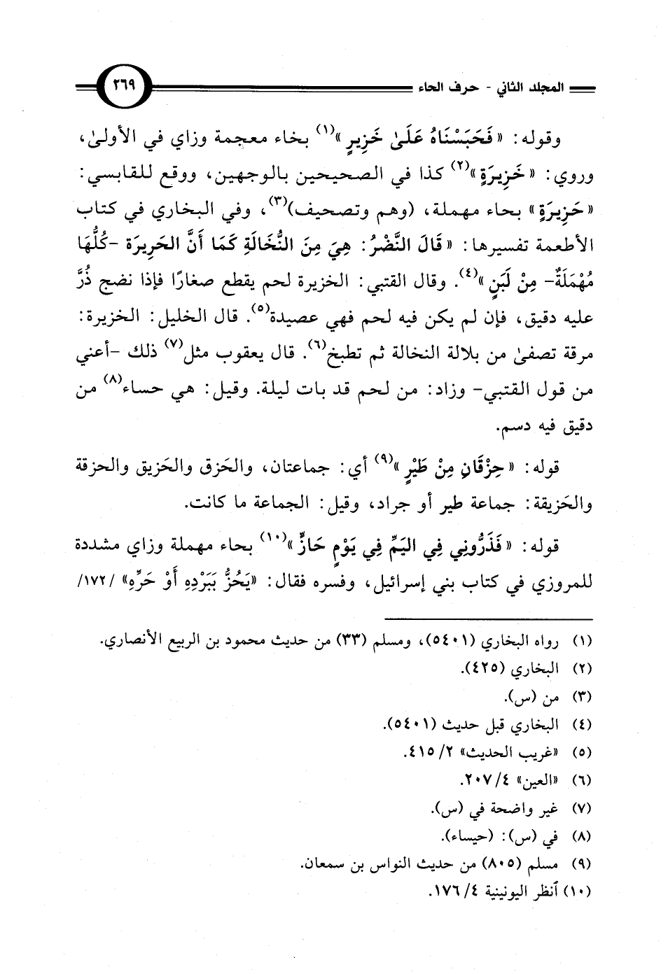 وقوله: "فَحَبَسْنَاهُ عَلَى خَزِيرٍ" (¬1) بخاء معجمة وزاي في الأولى، وروي: "خَزِيرَةٍ" (¬2) كذا في الصحيحين بالوجهين، ووقع للقابسي: "حَزِيرَةٍ" بحاء مهملة، (وهم وتصحيف) (¬3)، وفي البخاري في كتاب الأطعمة تفسيرها: "قَالَ النَّضْرُ: هِيَ مِنَ النُّخَالَةِ كَمَا أَنَّ الحَرِيرَة - كُلُّهَا مُهْمَلَةٌ - مِنْ لَبَنٍ" (¬4). وقال القتبي: الخزيرة لحم يقطع صغارًا فإذا نضج ذُرَّ عليه دقيق، فإن لم يكن فيه لحم فهي عصيدة (¬5). قال الخليل: الخزيرة: مرقة تصفى من بلالة النخالة ثم تطبخ (¬6). قال يعقوب مثل (¬7) ذلك -أعني من قول القتبي - وزاد: من لحم قد بات ليلة. وقيل: هي حساء (¬8) من دقيق فيه دسم.