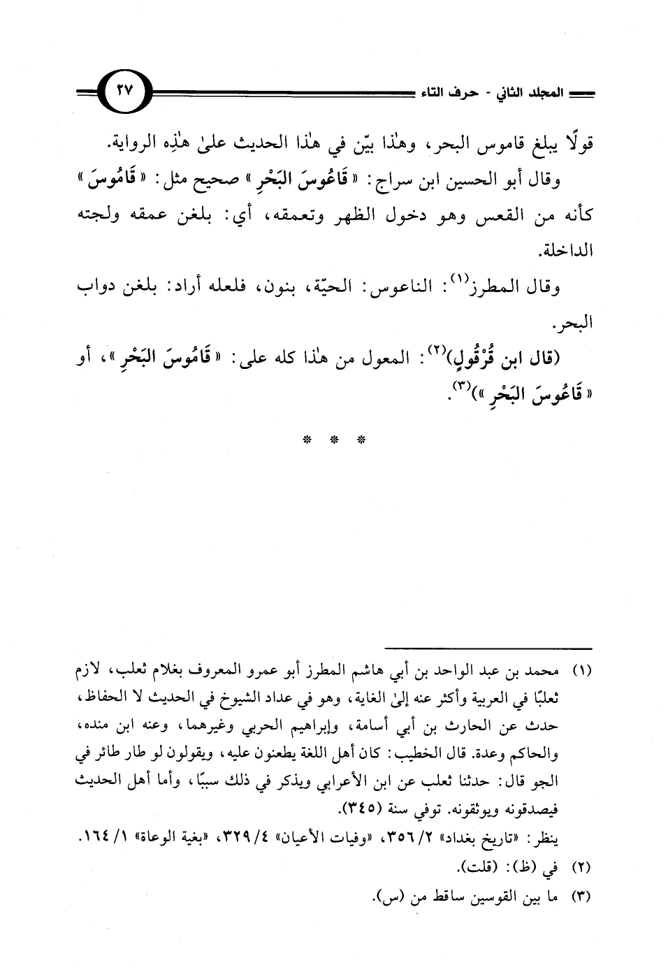 (قال ابن قُرْقُولٍ) (¬2): المعول من هذا كله على: "قَامُوسَ البَحْرِ"، أو "قَاعُوسَ البَحْرِ") (¬3).