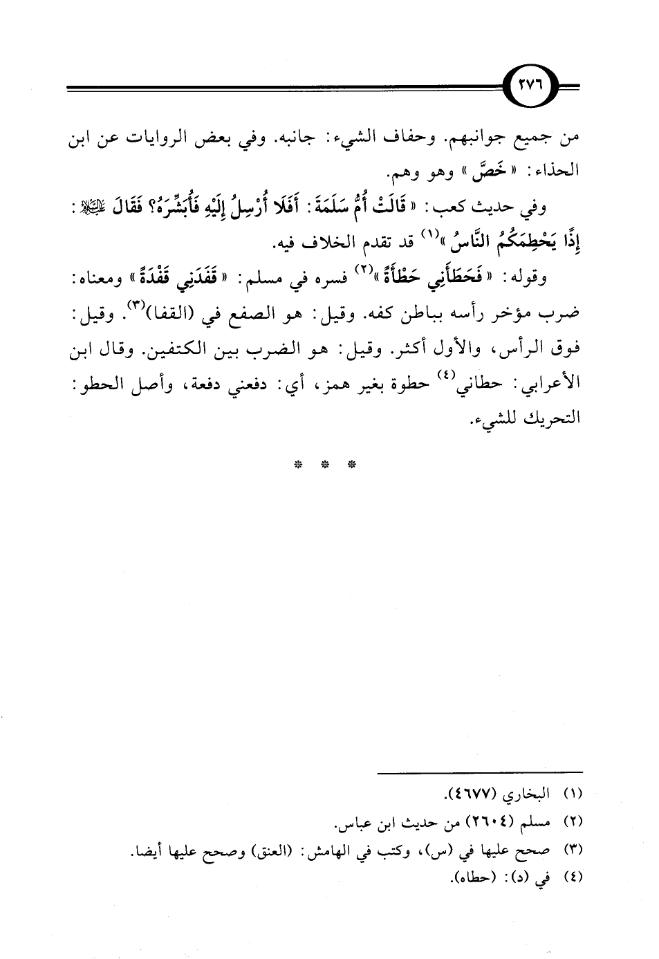 وقوله: "فَحَطَأَنِي حَطْأَةً" (¬2) فسره في مسلم: "قَفَدَنِي قَفْدَةً" ومعناه: ضرب مؤخر رأسه بباطن كفه. وقيل: هو الصفع في (القفا) (¬3). وقيل: فوق الرأس، والأول أكثر. وقيل: هو الضرب بين الكتفين. وقال ابن الأعرابي: حطاني (¬4) حطوة بغير همز، أي: دفعني دفعة، وأصل الحطو: التحريك للشيء.