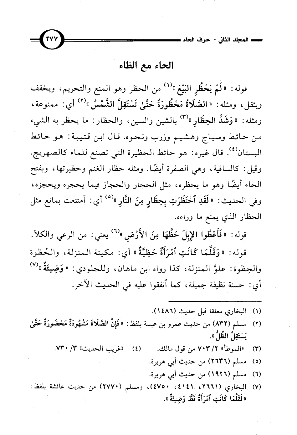وقيل: كالساقية، وهي الصفرة أيضًا. ومثله حظار الغنم وحظيرتها، وبفتح الحاء أيضًا وهو ما يحظره، مثل الحجار والحجاز فيما يحجره ويحجزه، وفي الحديث: "لَقَدِ احْتَظَرْتِ بِحِظَارٍ مِنَ النَّارِ" (¬5) أي: امتنعت بمانع مثل الحظار الذي يمنع ما وراءه.