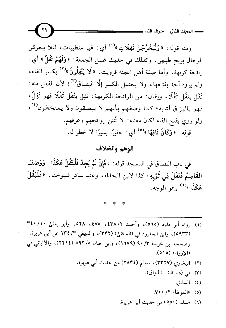 ومنه قوله: "وَلْيَخْرُجْنَ تَفِلَاتٍ" (¬1) أي: غير متطيبات، لئلا يحركن الرجال بريح طيبهن، وكذلك في حديث غسل الجمعة: "وَلَهُمْ تَفَلٌ" أي: رائحة كريهة، وأما صفة أهل الجنة فرويت: "لَا يَتْفِلُونَ" (¬2) بكسر الفاء، ولم يروه أحد بفتحها، ولا يحتمل الكسر إلاَّ البصاق (¬3)؛ لأن الفعل منه: تَفَل يتفُل تَفْلاً، ويقال: من الرائحة الكريهة: تَفِل يتْفَل تَفْلاً فهو تَفِلٌ، فهو بالبزاق أشبه؛ كما وصفهم بأنهم لا يبصقون ولا يمتخطون (¬4)، ولو روي بفتح الفاء لكان معناه: لا تُنتن روائحهم وعرقهم.