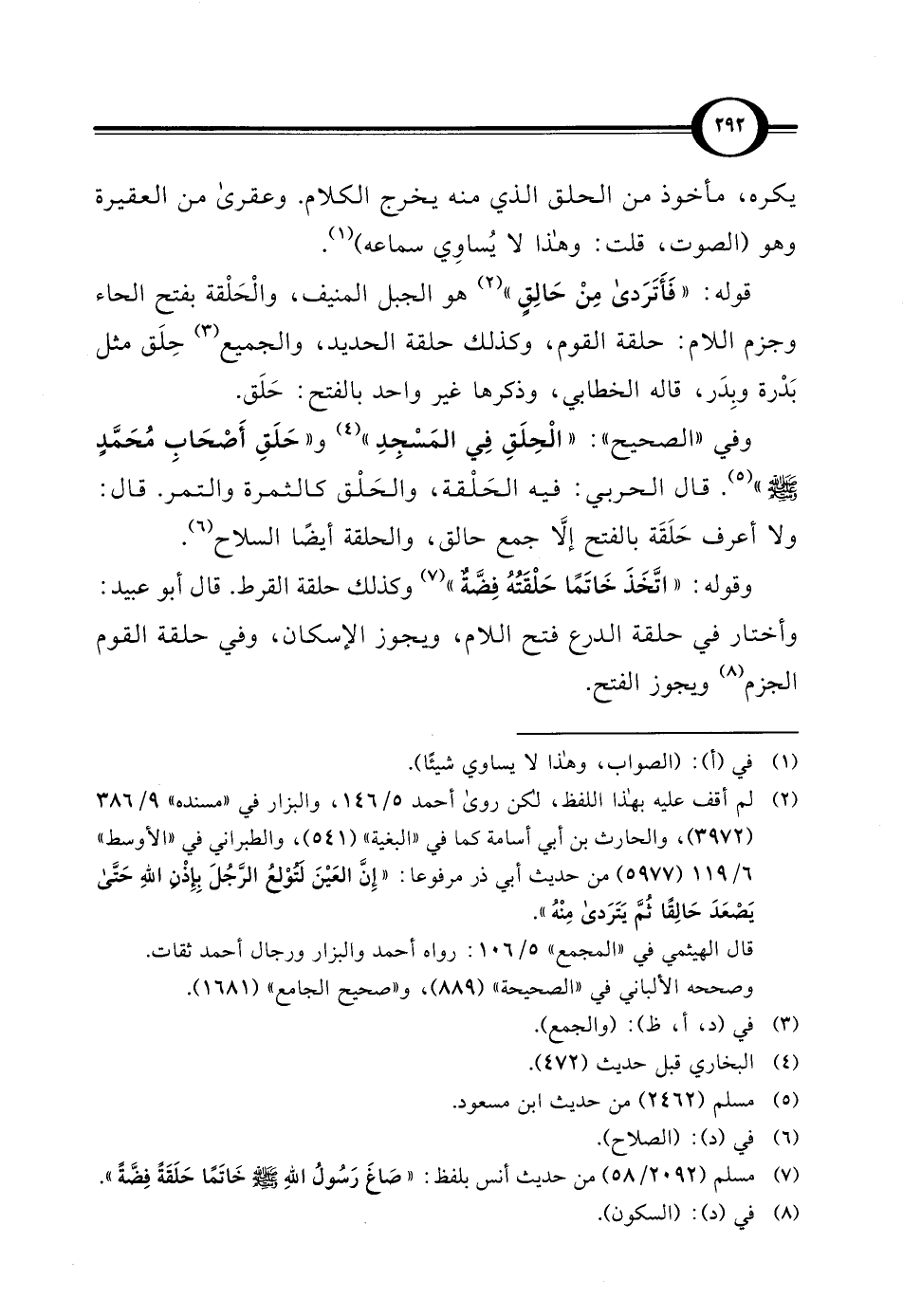 وقوله: "اتَّخَذَ خَاتَمًا حَلْقَتُهُ فِضَّةٌ" (¬7) وكذلك حلقة القرط. قال أبو عبيد: وأختار في حلقة الدرع فتح اللام، ويجوز الإسكان، وفي حلقة القوم الجزم (¬8) ويجوز الفتح.