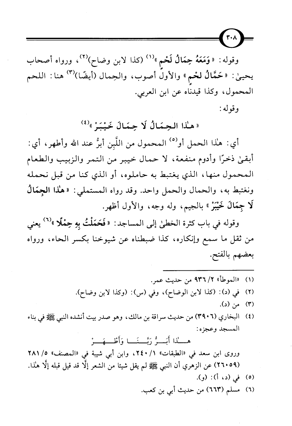 وقوله في باب كثرة الخطى إلى المساجد: "فَحَمَلْتُ بِهِ حِمْلًا" (¬6) يعني من ثقل ما سمع وإنكاره، كذا ضبطناه عن شيوخنا بكسر الحاء، ورواه بعضهم بالفتح.