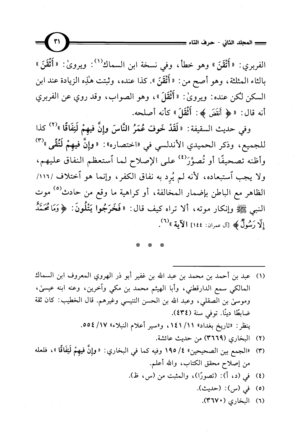 وفي حديث السقيفة: "لَقَدْ خَوفَ عُمَرُ النَّاسَ وإِنَّ فيهِمْ لَنِفَاقًا" (¬2) كذا للجميع، وذكر الحميدي الأندلسي في "اختصاره": "وإِنَّ فيهِمْ لَتُقًى" (¬3) وأظنه تصحيفا أو تُصوَّرَ (¬4) على الإصلاح لما استعظم النفاق عليهم، ولا يجب استبعاده, لأنه لم يُرِد به نفاق الكفر، وإنما هو اختلاف الظاهر مع الباطن بإضمار المخالفة، أو كراهية ما وقع من حادث (¬5) موت النبي - صلى الله عليه وسلم - وإنكار موته، ألا تراه كيف قال: "فَخَرَجُوا يَتْلُونَ: {وَمَا مُحَمَّدٌ إِلَّا رَسُولٌ} [آل عمران: 144] الآية (¬6).