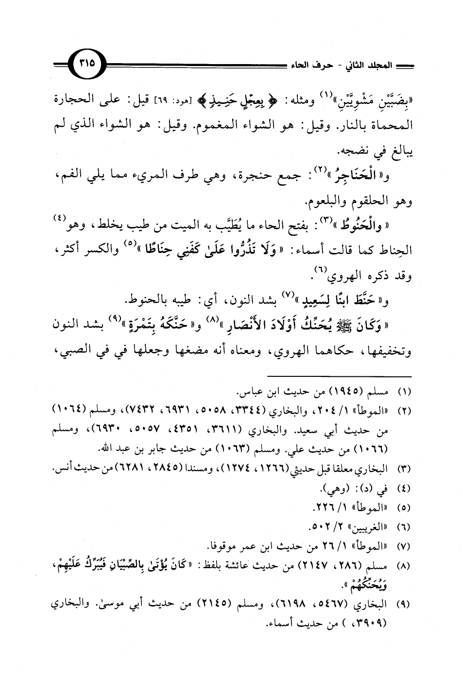 " وَكَانَ - صلى الله عليه وسلم - يُحَنِّكُ أَوْلَادَ الأَنْصَارِ" (¬8) و"حَنَّكَهُ بِتَمْرَةٍ" (¬9) بشد النون وتخفيفها، حكاهما الهروي، ومعناه أنه مضغها وجعلها في في الصبي،