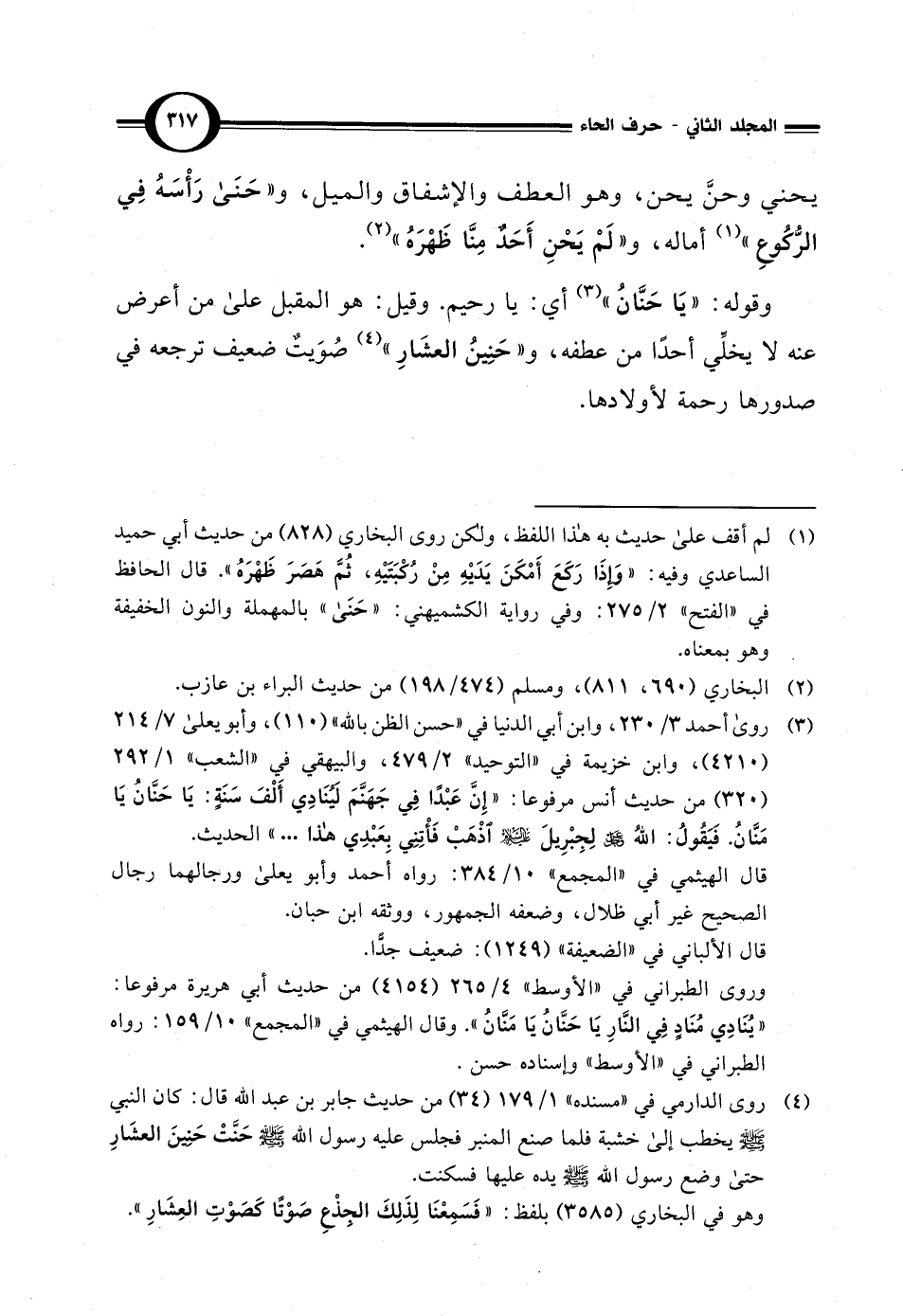 وقوله: "يَا حَنَّانُ" (¬3) أي: يا رحيم. وقيل: هو المقبل على من أعرض عنه لا يخلِّي أحدًا من عطفه، و"حَنِينُ العشَارِ" (¬4) صُوَيتٌ ضعيف ترجعه في صدورها رحمة لأولادها.