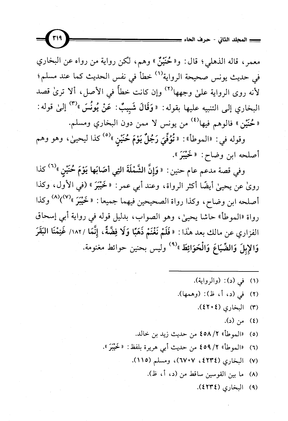 وفي قصة مدعم عام حنين: "وَإِنَّ الشَّمْلَةَ التِي أصَابَها يَوْمَ حُنَيْنٍ" (¬6) كذا روى عن يحيى أيضًا أكثر الرواة، وعند أبي عمر: "خَيْبَرَ" (في الأول، وكذا أصلحه ابن وضاح، وكذا رواة الصحيحين فيهما جميعاً: "خَيْبَرَ" (¬7)) (¬8) وكذا رواة "الموطأ" حاشا يحيى، وهو الصواب، بدليل قوله في رواية أبي إسحاق الفزاري عن مالك بعد هذا: "فَلَمْ نَغْنَمْ ذَهَبًا وَلَا فِضَّةً، إِنَّمَا غَنِمْنَا البَقَرَ وَالإِبِلَ وَالضّيَاعَ وَالْحَوَائِطَ" (¬9) وليس بحنين حوائط مغنومة.