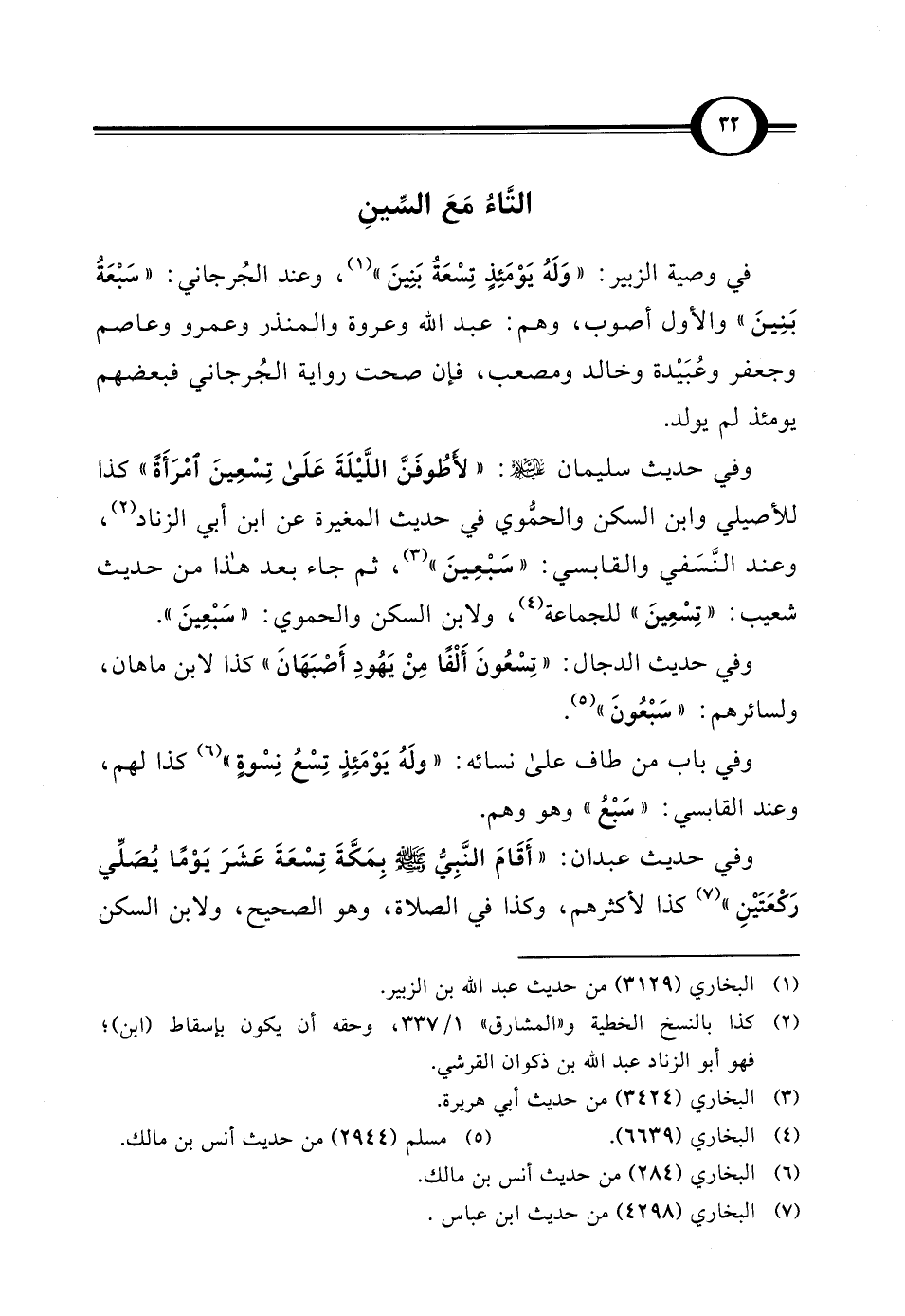 وفي حديث سليمان - عليه السلام -:"لأَطُوفَنَّ اللَّيْلَةَ عَلَى تِسْعِينَ امْرَأَةً" كذا للأصيلي وابن السكن والحمُّوي في حديث المغيرة عن ابن أبي الزناد (¬2)، وعند النَّسَفي والقابسي: "سَبْعِينَ" (¬3)، ثم جاء بعد هذا من حديث شعيب: "تِسْعِينَ" للجماعة (¬4)، ولابن السكن والحموي: "سَبْعِينَ".