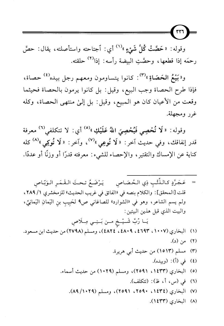 وقوله: "لَا تُحْصِي فَيُحْصِيَ اللهُ عَلَيْكِ" (¬5) أي: لا تتكلفي (¬6) معرفة قدر إنفاقك، وفي حديث آخر: "لَا تُوعِي" (¬7)، وآخر: "لَا تُوكِي" (¬8) كله كناية عن الإمساك والتقتير، والإحصاء للشيء: معرفته قدرًا أو وزنًا أو عددًا.