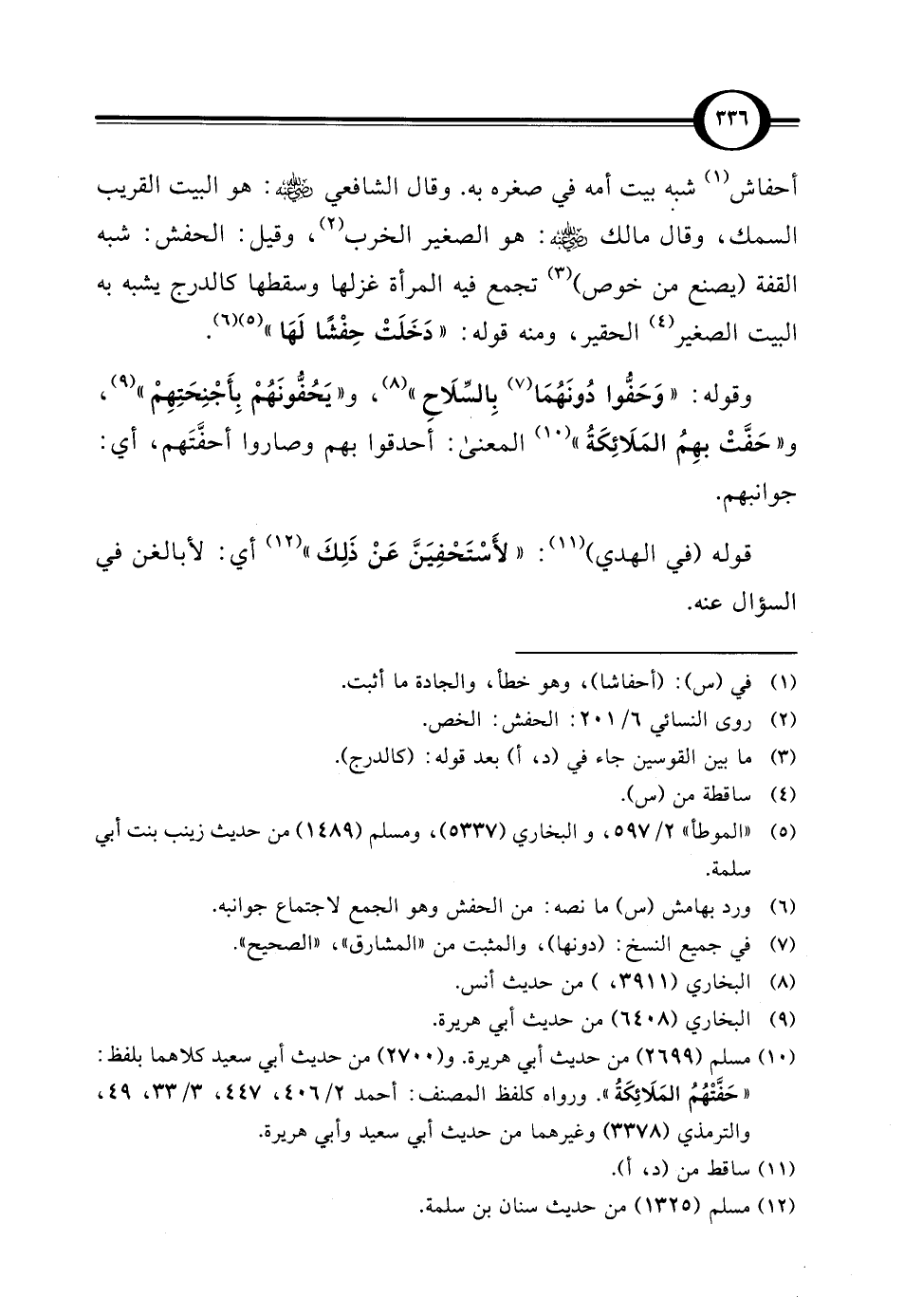 وقوله: "وَحَفُّوا دُونَهُمَا (¬7) بِالسِّلَاحِ" (¬8)، و"يَحُفُّونَهُمْ بِأَجْنِحَتِهِمْ" (¬9)، و"حفَّتْ بهِمُ المَلَائِكَةُ" (¬10) المعنى: أحدقوا بهم وصاروا أحفَّتَهم، أي: جوانبهم.
