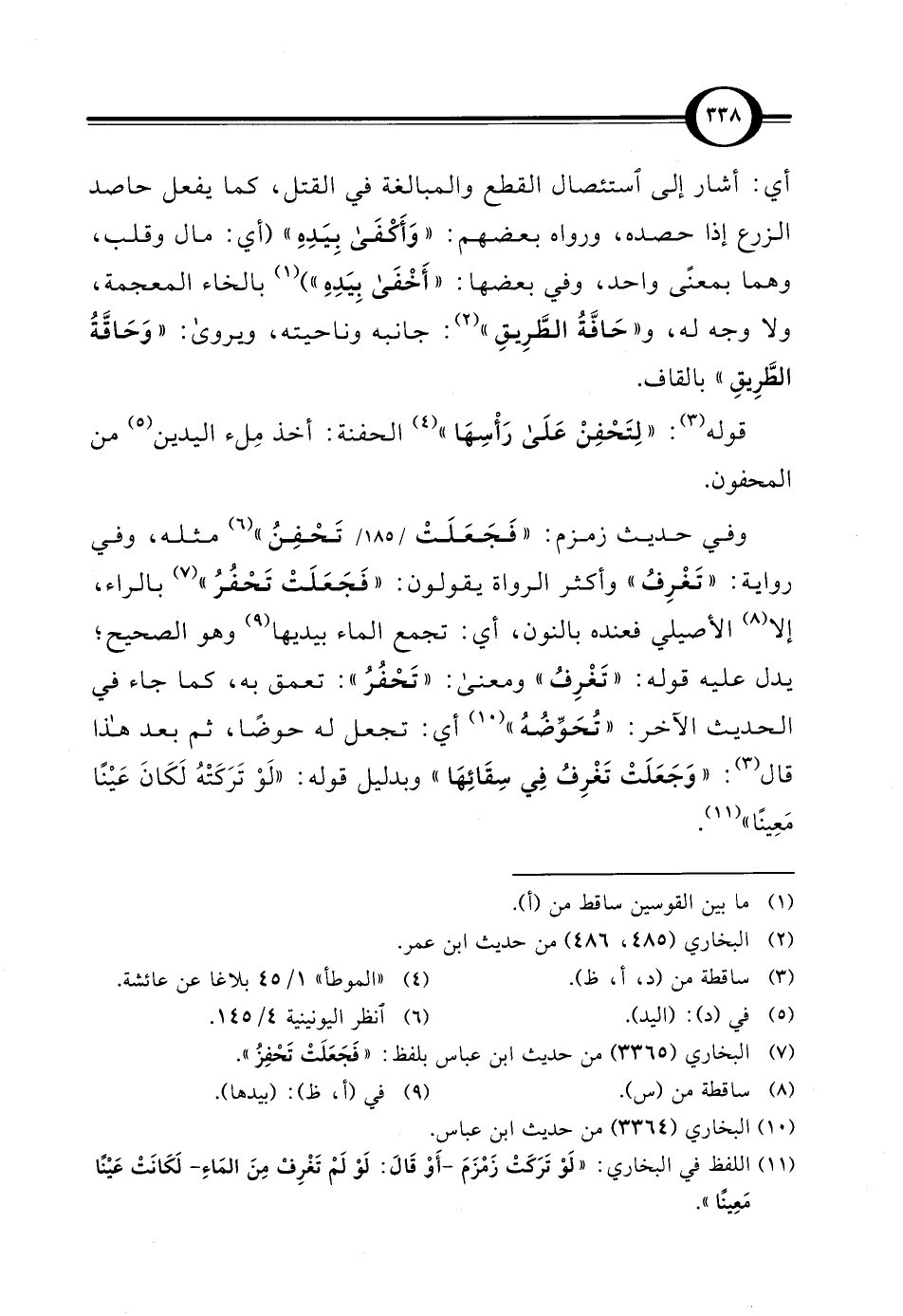 وفي حديث زمزم: "فَجَعَلَتْ تَحْفِنُ" (¬6) مثله، وفي رواية: "تَغْرِفُ" وأكثر الرواة يقولون: "فَجَعَلَتْ تَحْفُرُ" (¬7) بالراء، إلا (¬8) الأصيلي فعنده بالنون، أي: تجمع الماء بيديها (¬9) وهو الصحيح؛ يدلس عليه قوله: "تَغْرِفُ" ومعنى: "تَحْفُرُ": تعمق به، كما جاء في الحديث الآخر: "تُحَوِّضُهُ" (¬10) أي: تجعل له حوضًا، ثم بعد هذا قال (3): "وَجَعَلَتْ تَغْرِفُ في سِقَائِهَا" وبدليل قوله: "لَوْ تَرَكَتْهُ لَكَانَ عَيْنًا مَعِينًا" (¬11).