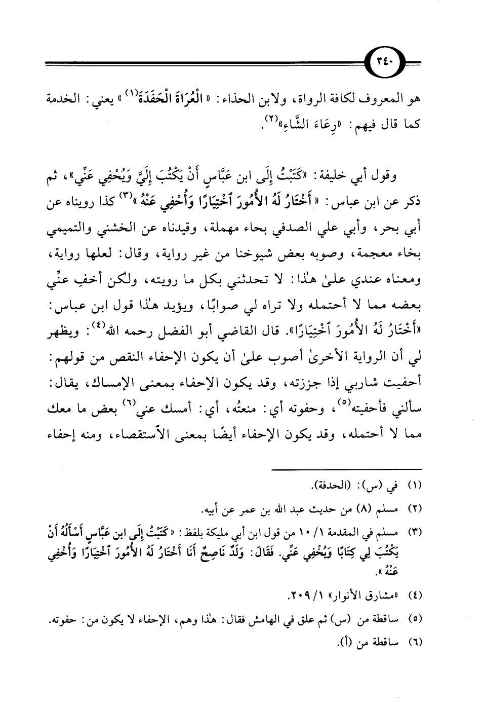 وقول أبي خليفة: "كَتَبْتُ إِلَى ابن عَبَّاسٍ أَنْ يَكْتُبَ إِليَّ وَيُحْفِي عَنَي"، ثم ذكر عن ابن عباس: "أَخْتَارُ لَهُ الأمُورَ اخْتِيَارًا وَأُحْفِي عَنْه)) (¬3) كذا رويناه عن أبي بحر، وأبي علي الصدفي بحاء مهملة، وقيدناه عن الخشني والتميمي بخاء معجمة، وصوبه بعض شيوخنا من غير رواية, وقال: لعلها رواية, ومعناه عندي على هذا: لا تحدثني بكل ما رويته، ولكن أخفِ عنِّي بعضه مما لا أحتمله ولا تراه لي صوابًا، ويؤيد هذا قول ابن عباس: "أَخْتَارُ لَهُ الأُمُورَ اخْتِيَارًا". قال القاضي أبو الفضل رحمه الله (¬4): ويظهر لي أن الرواية الأخرى أصوب على أن يكون الإحفاء النقص من قولهم: أحفيت شاربي إذا جززته، وقد يكون الإحفاء بمعنى الإمساك، يقال: سألني فأحفيته (¬5)، وحفوته أي: منعتُه، أي: أمسك عني (¬6) بعض ما معك مما لا أحتمله، وقد يكون الإحفاء أيضًا بمعنى الاستقصاء، ومنه إحفاء