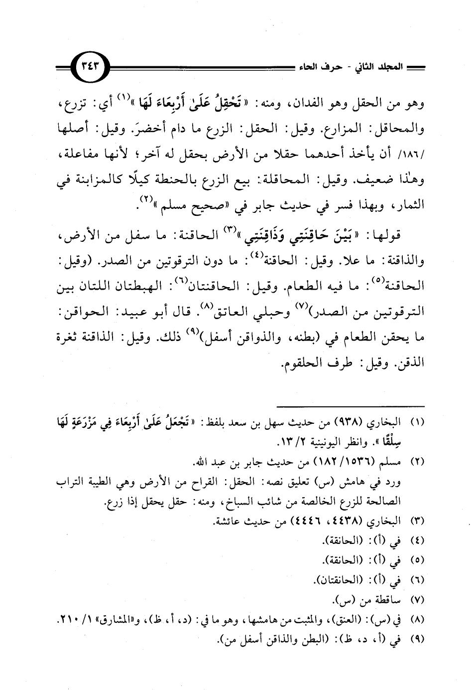 (¬2) مسلم (1536/ 182) من حديث جابر بن عبد الله. ورد في هامش (س) تعليق نصه: الحقل: القراح من الأرض وهي الطيبة التراب الصالحة للزرع الخالصة من شائب السباخ، ومنه: حقل يحقل إذا زرع.