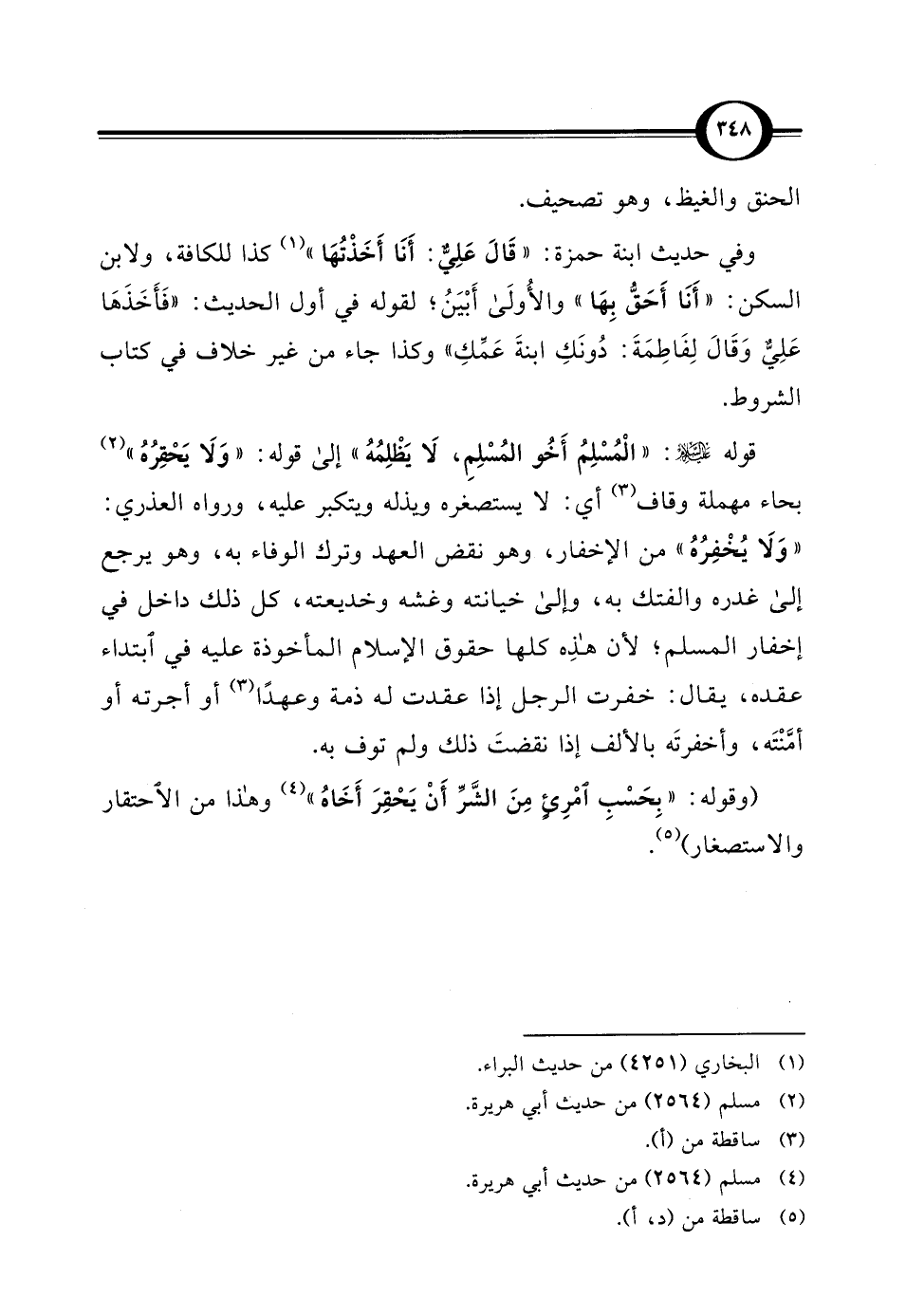 قوله عليه السلام: "الْمُسْلِمُ أَخُو المُسْلِمِ، لَا يَظْلِمُهُ" إلى قوله: "وَلَا يَحْقرُهُ" (¬2) بحاء مهملة وقاف (¬3) أي: لا يستصغره ويذله ويتكبر عليه، ورواه العذري: "وَلَا يُخْفِرُهُ" من الإخفار، وهو نقض العهد وترك الوفاء به، وهو يرجع إلى غدره والفتك به، وإلى خيانته وغشه وخديعته، كل ذلك داخل في إخفار المسلم؛ لأن هذِه كلها حقوق الإِسلام المأخوذة عليه في ابتداء عقده، يقال: خفرت الرجل إذا عقدت له ذمة وعهدًا (3) أو أجرته أو أمَّنْتَه، وأخفرتَه بالألف إذا نقضتَ ذلك ولم توف به.