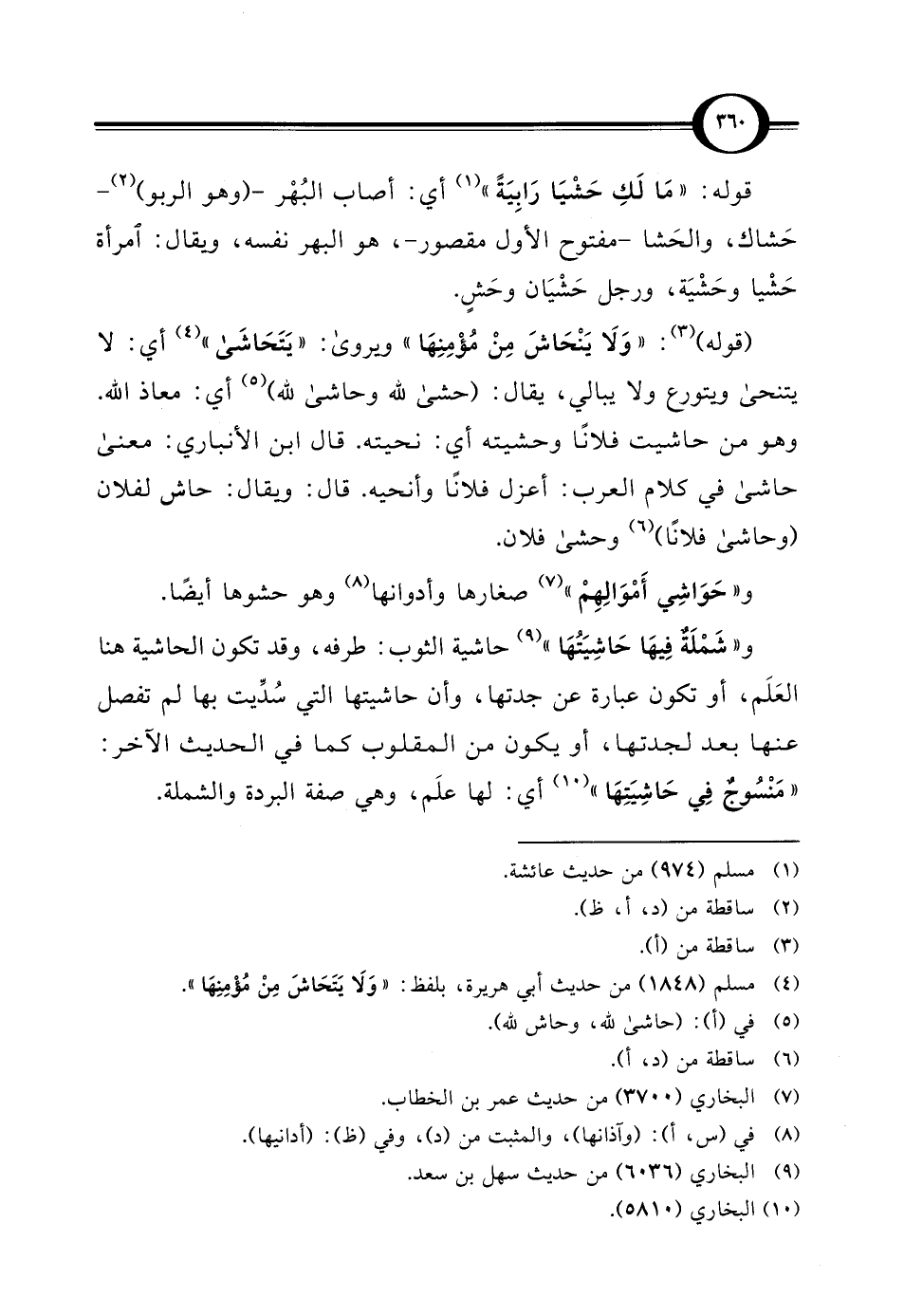 و"شَمْلَةٌ فِيهَا حَاشِيَتُهَا" (¬9) حاشية الثوب: طرفه، وقد تكون الحاشية هنا العَلَم، أو تكون عبارة عن جدتها، وأن حاشيتها التي سُدِّيت بها لم تفصل عنها بعد لجدتها، أو يكون من المقلوب كما في الحديث الآخر: "مَنْسُوجٌ في حَاشِيَتِهَا" (¬10) أي: لها علَم، وهي صفة البردة والشملة.