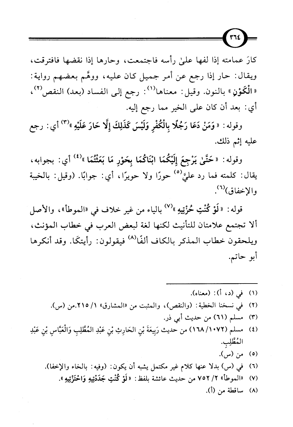 كارَ عمامته إذا لفها على رأسه فاجتمعت، وحارها إذا نقضها فافترقت، ويقال: حار إذا رجع عن أمر جميل كان عليه، ووهَّم بعضهم رواية: "الْكَوْن" بالنون. وقيل: معناها (¬1): رجع إلى الفساد (بعد) النقص (¬2)، أي: بعد أن كان على الخير مما رجع إليه.