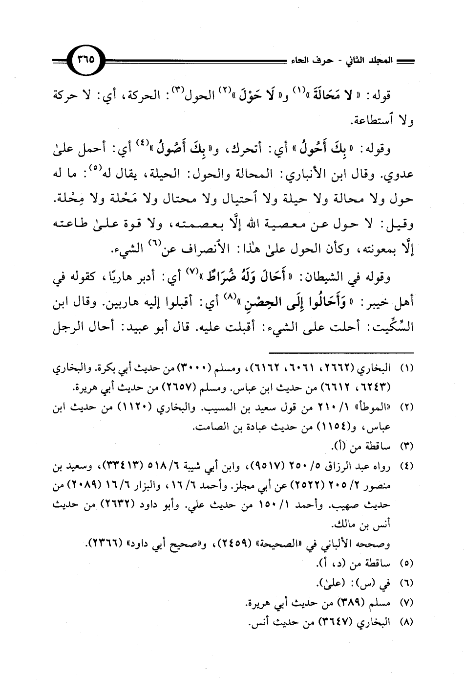 وقيل: لا حول عن معصية الله إلاَّ بعصمته، ولا قوة على طاعته إلاَّ بمعونته، وكأن الحول على هذا: الانصراف عن (¬6) الشيء.