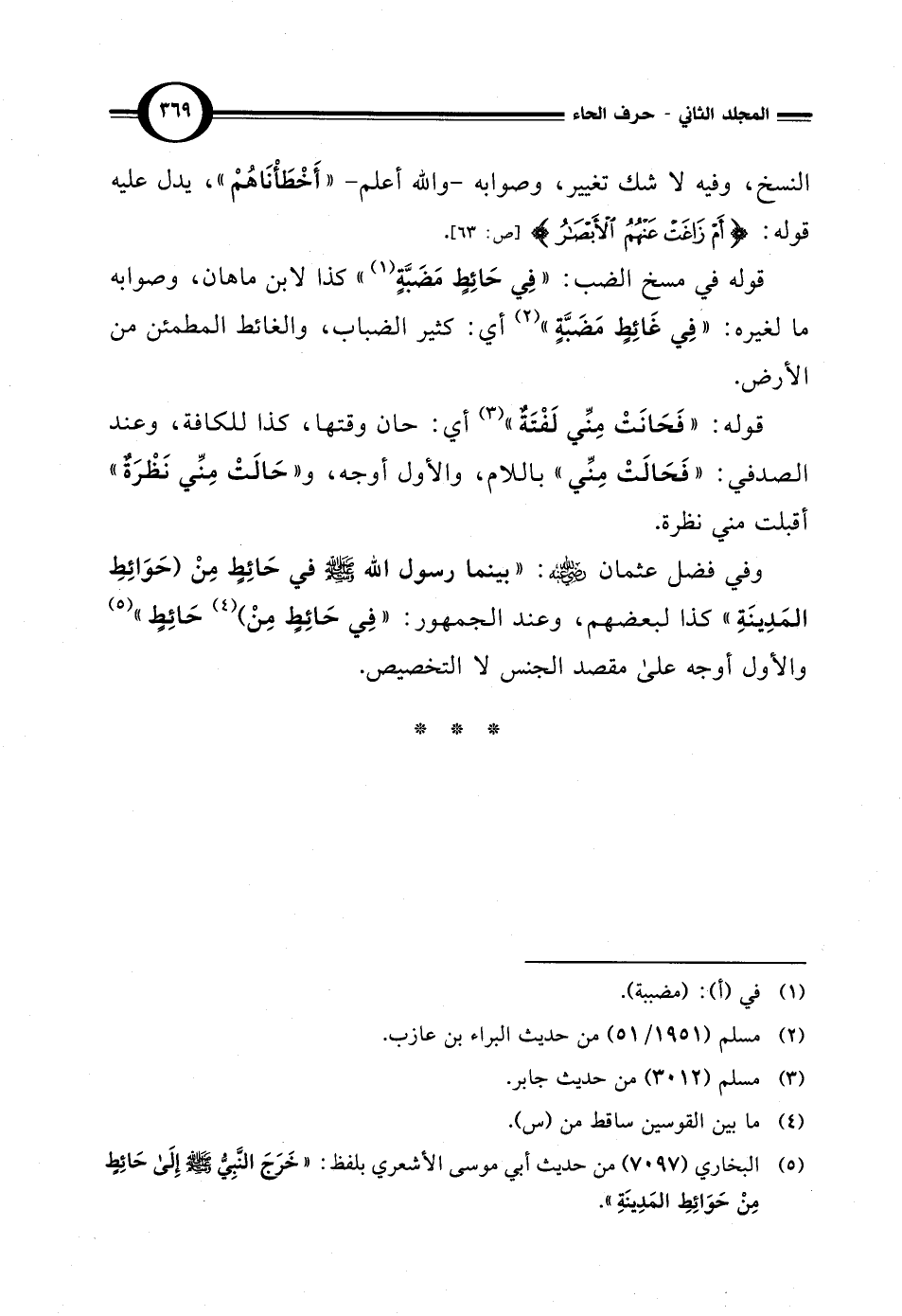 وفي فضل عثمان - رضي الله عنه -: " بينما رسول الله - صلى الله عليه وسلم - في حَائِطٍ مِنْ (حَوَائِطِ المَدِينَةِ" كذا لبعضهم، وعند الجمهور: "في حَائِطٍ مِنْ) (¬4) حَائِطٍ" (¬5) والأول أوجه على مقصد الجنس لا التخصيص.