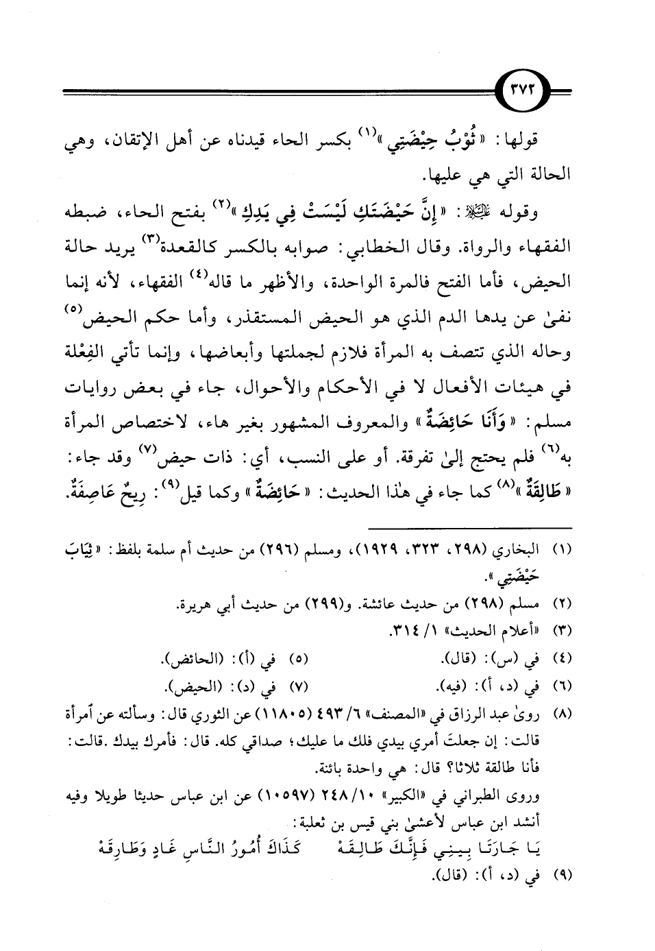 وقوله عليه السلام: "إِنَّ حَيْضَتَكِ لَيْسَتْ في يَدِكِ" (¬2) بفتح الحاء، ضبطه الفقهاء والرواة. وقال الخطابي: صوابه بالكسر كالقعدة (¬3) يريد حالة الحيض، فأما الفتح فالمرة الواحدة، والأظهر ما قاله (¬4) الفقهاء, لأنه إنما نفى عن يدها الدم الذي هو الحيض المستقذر، وأما حكم الحيض (¬5) وحاله الذي تتصف به المرأة فلازم لجملتها وأبعاضها، وإنما تأتي الفِعْلة في هيئات الأفعال لا في الأحكام والأحوال، جاء في بعض روايات مسلم: " وَأَنَا حَائِضَةٌ" والمعروف المشهور بغير هاء، لاختصاص المرأة به (¬6) فلم يحتج إلى تفرقة. أو على النسب، أي: ذات حيض (¬7) وقد جاء: "طَالِقَةٌ" (¬8) كما جاء في هذا الحديث: "حَائِضَةٌ" وكما قيل (¬9): رِيحٌ عَاصِفَةٌ.