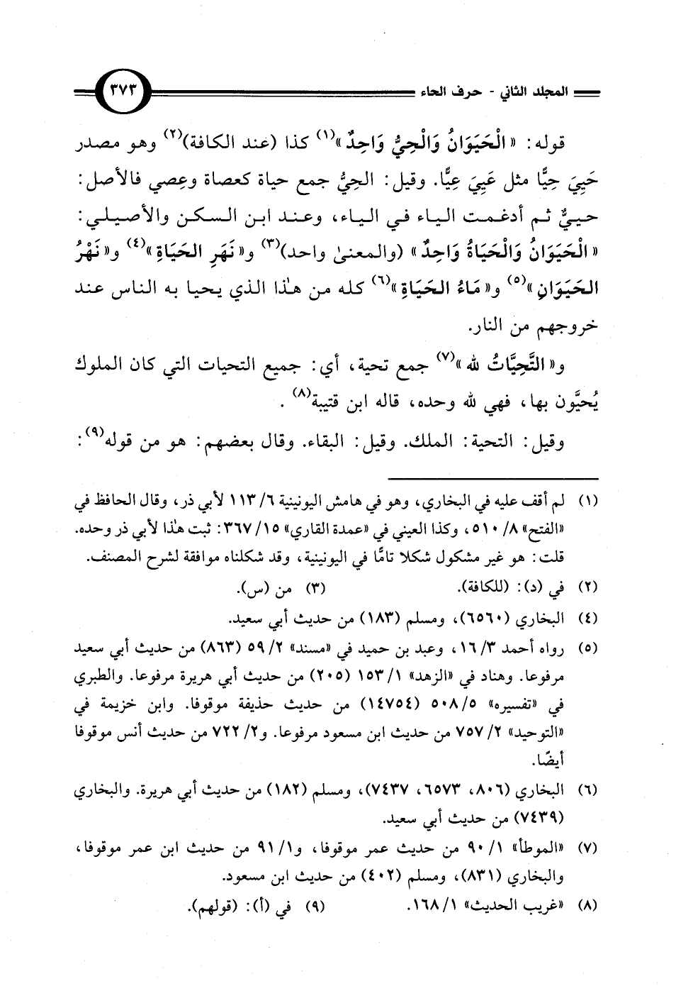 قوله: "الْحَيَوَانُ وَالْحِيُّ وَاحِدٌ" (¬1) كذا (عند الكافة) (¬2) وهو مصدر حَيِيَ حِيًّا مثل عَيِيَ عِيًّا. وقيل: الحِيُّ جمع حياة كعصاة وعِصي فالأصل: حييٌّ ثم أدغمت الياء في الياء، وعند ابن السكن والأصيلي: "الْحَيَوَانُ وَالْحَيَاةُ واحدٌ" (والمعنى واحد) (¬3) و"نَهَرِ الحَيَاةِ" (¬4) و"نَهْرُ الحَيَوَان" (¬5) و"مَاءُ الحَيَاةِ" (¬6) كله من هذا الذي يحيى به الناس عند خروجهم من النار.