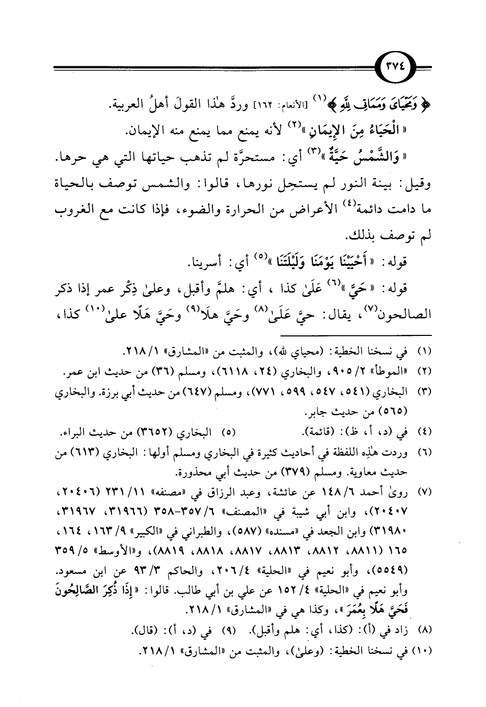 (¬7) روى أحمد 6/ 148 عن عائشة، وعبد الرزاق في "مصنفه" 11/ 231 (20406، 20407)، وابن أبي شيبة في "المصنف" 6/ 357 - 358 (31966، 31967، 31980) وابن الجعد في "مسنده" (587)، والطبراني في "الكبير" 9/ 163، 164، 165 (8811، 8812، 8813، 8817، 8818، 8819)، و"الأوسط" 5/ 359 (5549)، وأبو نعيم في "الحلية" 4/ 206، والحاكم 3/ 93 عن ابن مسعود. وأبو نعيم في "الحلية" 4/ 152 عن علي بن أبي طالب. قالوا: "إِذَا ذُكِرَ الصَّالِحُونَ فحَيَّ هَلًا بِعُمَرَ"، وكذا هي في "المشارق" 1/ 218.