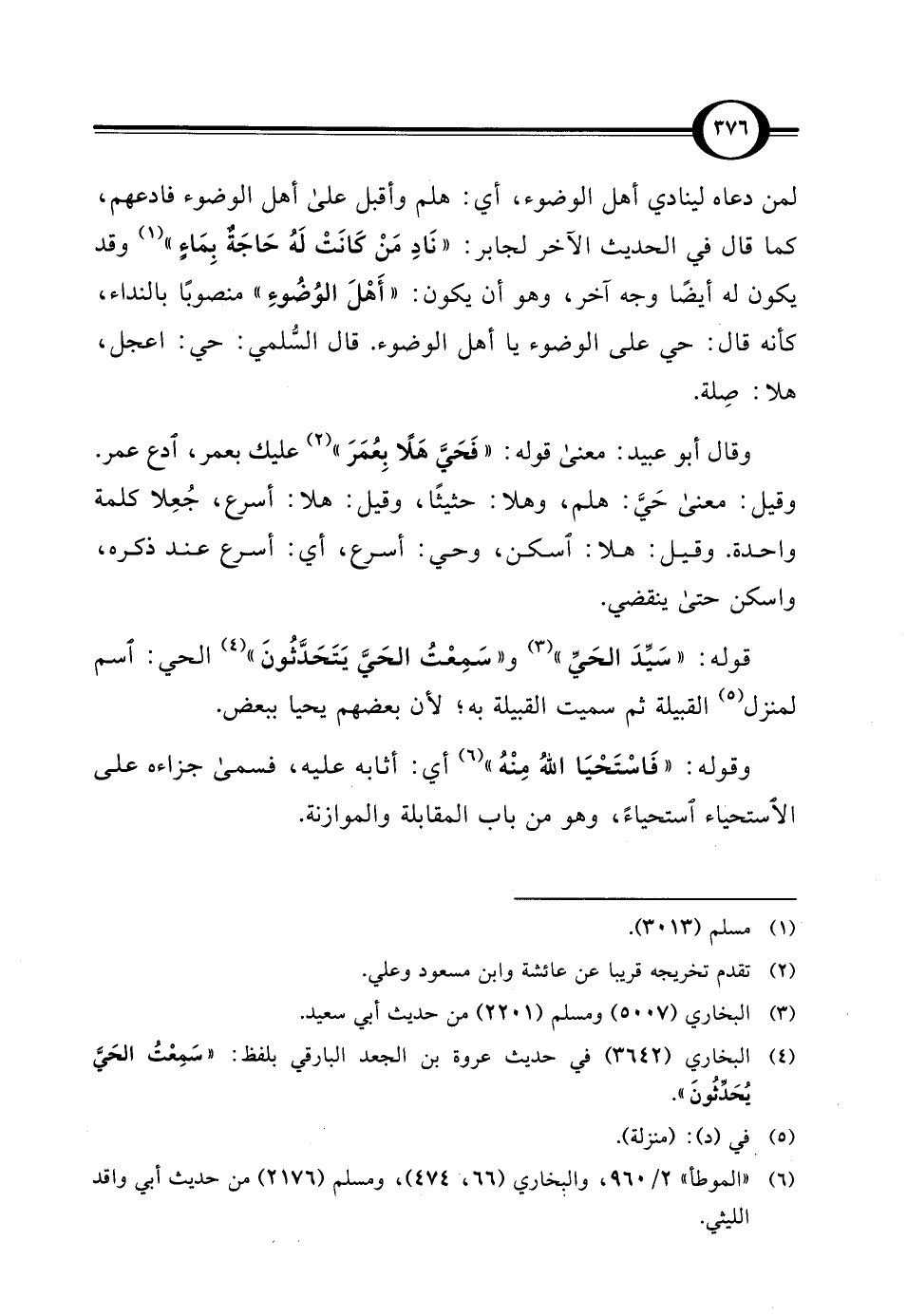 لمن دعاه لينادي أهل الوضوء، أي: هلم وأقبل على أهل الوضوء فادعهم، كما قال في الحديث الآخر لجابر: "نَادِ مَنْ كَانَتْ لَهُ حَاجَةٌ بِمَاءٍ" (¬1) وقد يكون له أيضًا وجه آخر، وهو أن يكون: " أَهْلَ الوُضُوءِ" منصوباً بالنداء، كأنه قال: حي على الوضوء يا أهل الوضوء. قال السُّلمي: حي: اعجل، هلا: صِلة.