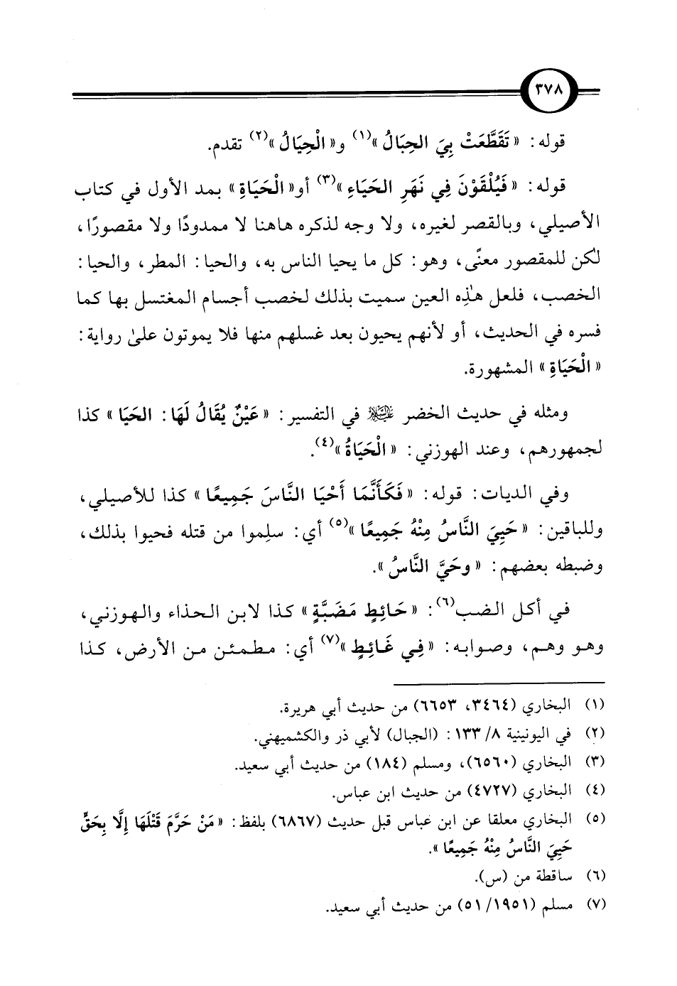 ومثله في حديث الخضر عليه السلام في التفسير: "عَيْنٌ يُقَالُ لَهَا: الحَيَا" كذا لجمهورهم، وعند الهوزني: "الْحَيَاةُ" (¬4).