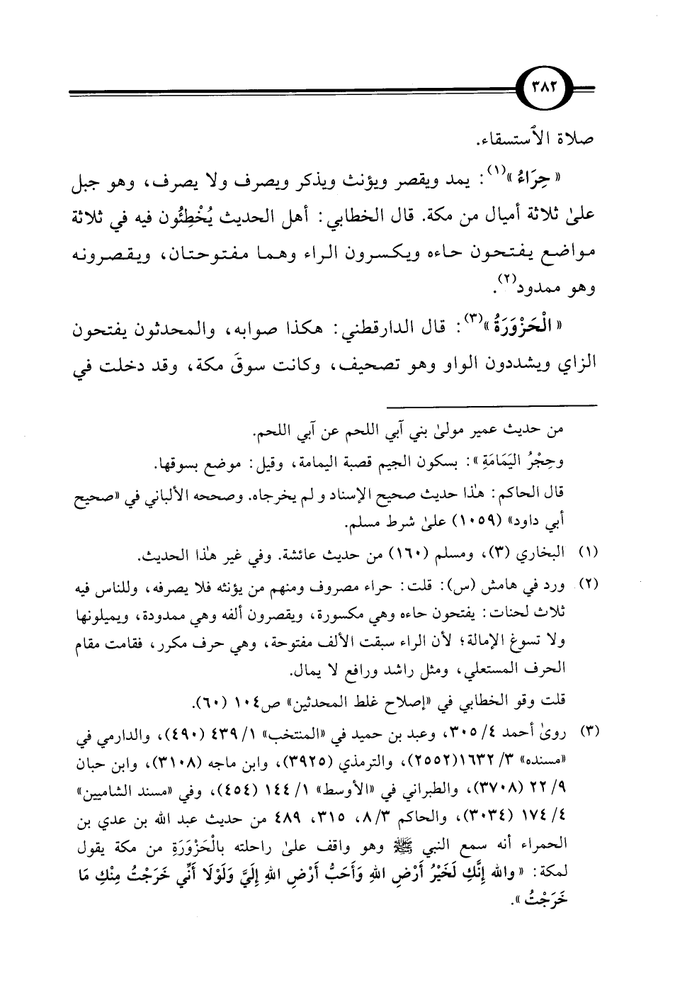 (¬2) ورد في هامش (س): قلت: حراء مصروف ومنهم من يؤنثه فلا يصرفه، وللناس فيه ثلاث لحنات: يفتحون حاءه وهي مكسورة، ويقصرون ألفه وهي ممدودة، ويميلونها ولا تسوغ الإمالة؛ لأن الراء سبقت الألف مفتوحة، وهي حرف مكرر، فقامت مقام الحرف المستعلي، ومثل راشد ورافع لا يمال. قلت وقو الخطابي في "إصلاح غلط المحدثين" ص 104 (60).