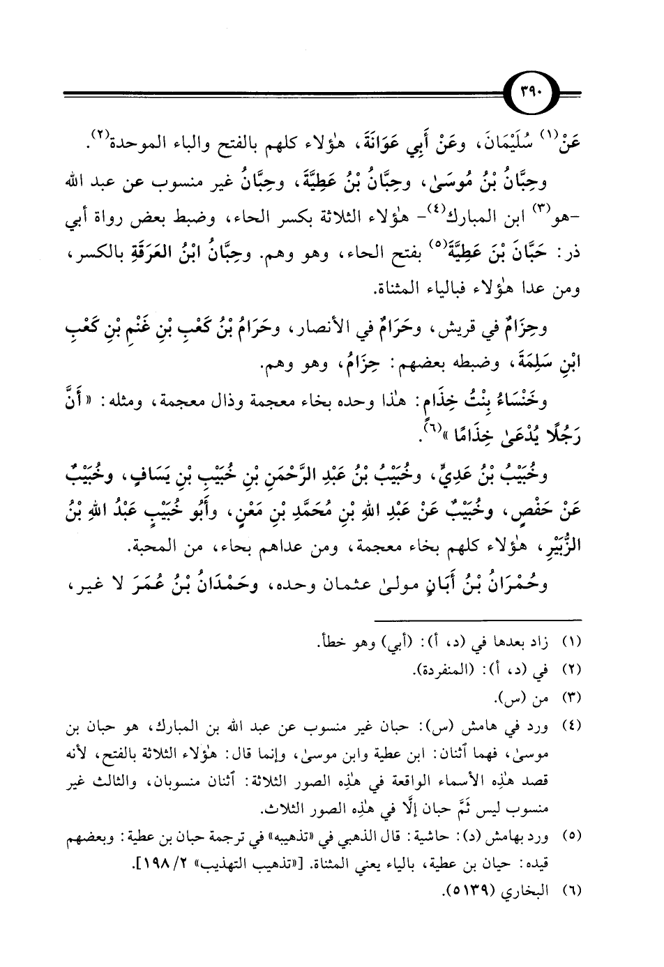 (¬4) ورد في هامش (س): حبان غير منسوب عن عبد الله بن المبارك، هو حبان بن موسى، فهما اثنان: ابن عطية وابن موسى، وإنما قال: هؤلاء الثلاثة بالفتح, لأنه قصد هذِه الأسماء الواقعة في هذِه الصور الثلاثة: اثنان منسوبان، والثالث غير منسوب ليس ثَم حبان إلا في هذِه الصور الثلاث.