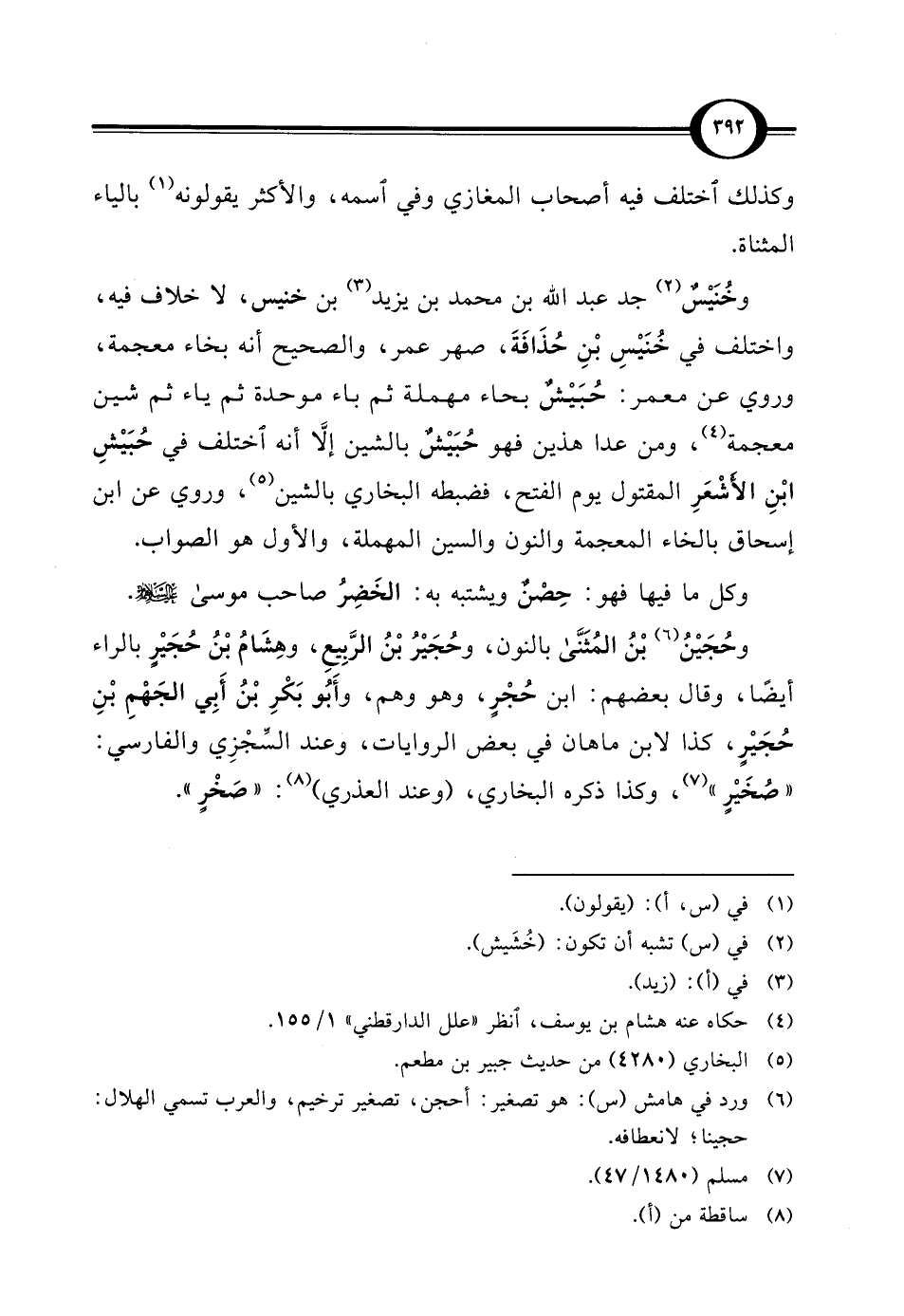 وخُنَيْسٌ (¬2) جد عبد الله بن محمَّد بن يزيد (¬3) بن خنيس، لا خلاف فيه، واختلف في خُنَيْسِ بْنِ حُذَافَةَ، صهر عمر، والصحيح أنه بخاء معجمة، وروي عن معمر: حُبَيْشٌ بحاء مهملة ثم باء موحدة ثم ياء ثم شين معجمة (¬4)، ومن عدا هذين فهو حُبَيْشٌ بالشين إلاَّ أنه اختلف في حُبَيْشِ ابْنِ الأشْعَرِ المقتول يوم الفتح، فضبطه البخاري بالشين (¬5)، وروي عن ابن إسحاق بالخاء المعجمة والنون والسين المهملة، والأول هو الصواب.