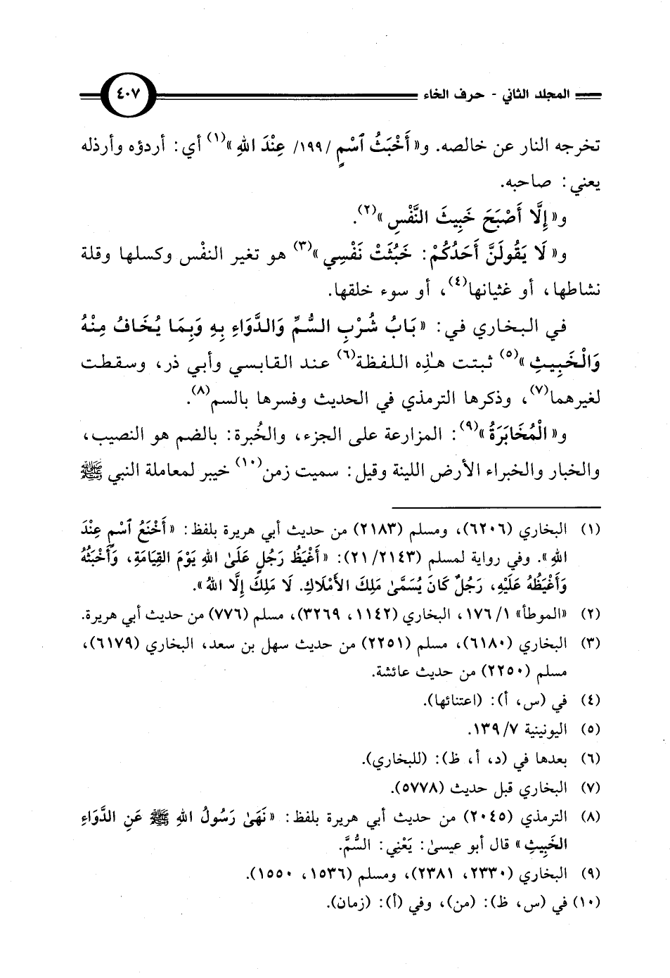 و"لَا يَقُولَنَّ أَحَدُكُمْ: خَبُثَتْ نَفْسِي" (¬3) هو تغير النفْس وكسلها وقلة نشاطها، أو غثيانها (¬4)، أو سوء خلقها.