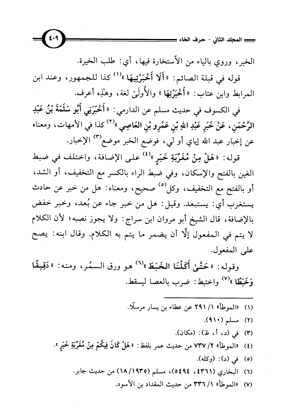(¬4) "الموطأ" 2/ 737 من حديث عمر بلفظ: "هَلْ كَانَ فِيكُمْ مِنْ مُغَرِّبَةِ خَبَرٍ".