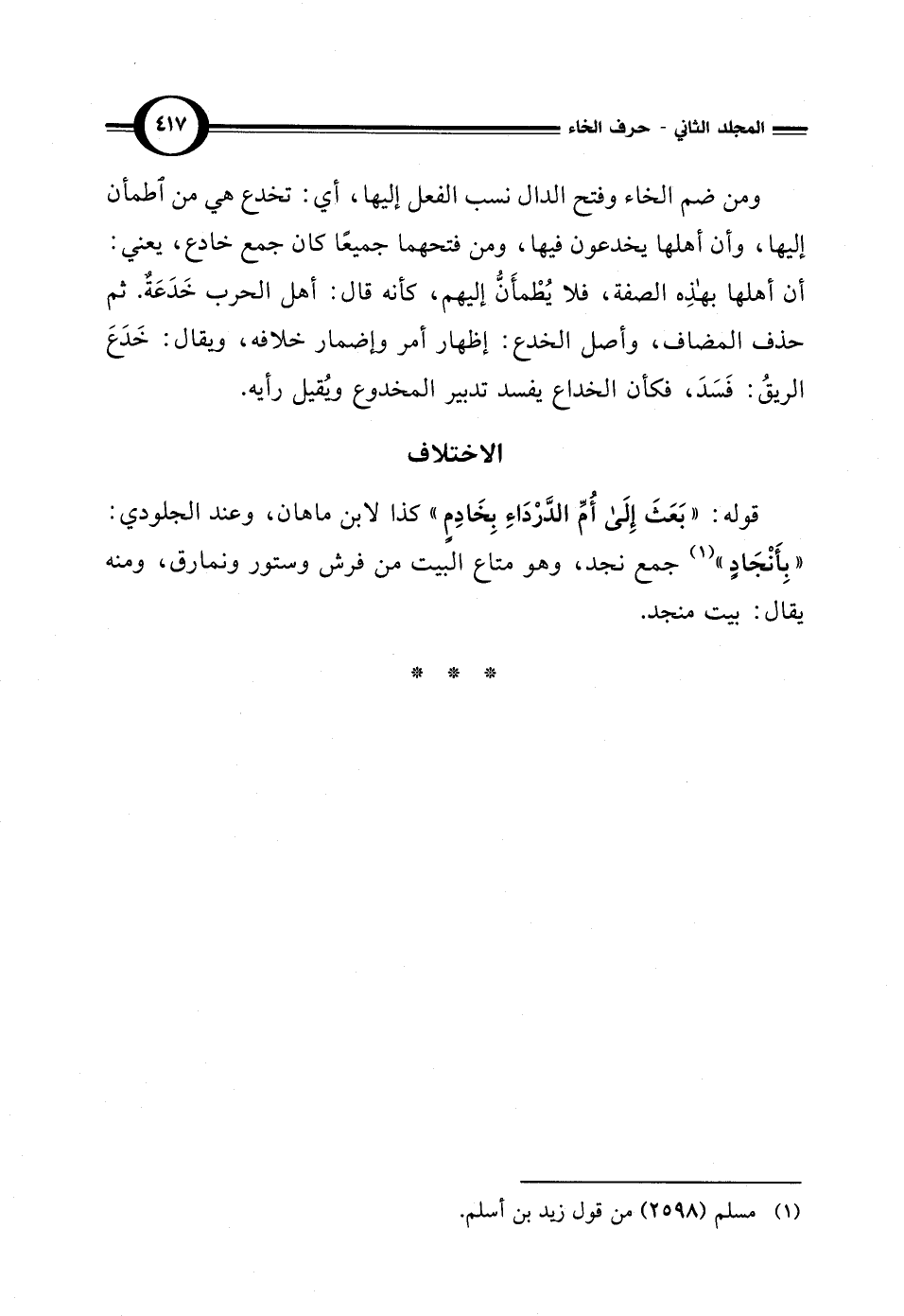 ومن ضم الخاء وفتح الدال نسب الفعل إليها، أي: تخدع هي من اطمأن إليها، وأن أهلها يخدعون فيها، ومن فتحهما جميعًا كان جمع خادع، يعني: أن أهلها بهذِه الصفة، فلا يُطْمأَنُّ إليهم، كأنه قال: أهل الحرب خَدَعَةٌ. ثم حذف المضاف، وأصل الخدع: إظهار أمر وإضمار خلافه، ويقال: خَدَعَ الريقُ: فَسَدَ، فكأن الخداع يفسد تدبير المخدوع ويُقيل رأيه.