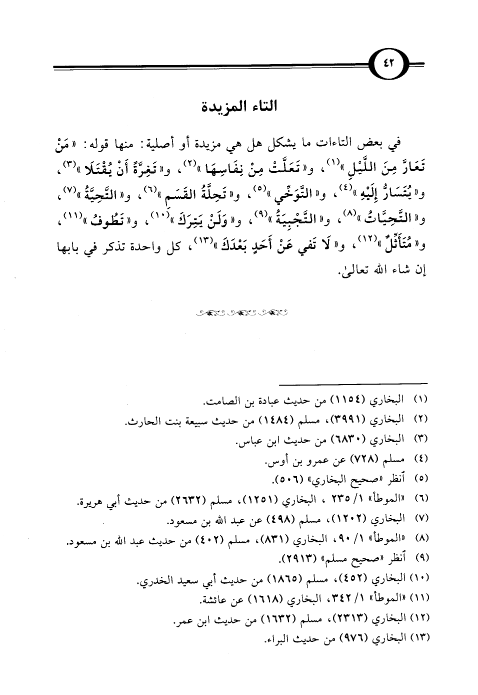 في بعض التاءات ما يشكل هل هي مزيدة أو أصلية: منها قوله: "مَنْ تَعَارَّ مِنَ اللَّيْلِ" (¬1)، و"تَعَلَّتْ مِنْ نِفَاسِهَا" (¬2)، و"تَغِرَّةً أَنْ يُقْتَلَا" (¬3)، و"يُتَسَارُّ إِلَيْهِ" (¬4)، و"التَّوَخِّي" (¬5)، و"تَحِلَّةُ القَسَمِ" (¬6)، و"التَّحِيَّةُ" (¬7)، و"التَّحِيَّاتُ" (¬8)، و"التَّجْبِيَةُ" (¬9)، و"وَلَنْ يَتِرَكَ" (¬10)، و"تَطُوفُ" (¬11)، و"مُتَأَثِّلٌ" (¬12)، و"لَا تَفي عَنْ أَحَدٍ بَعْدَكَ" (¬13)، كل واحدة تذكر في بابها إن شاء الله تعالى.