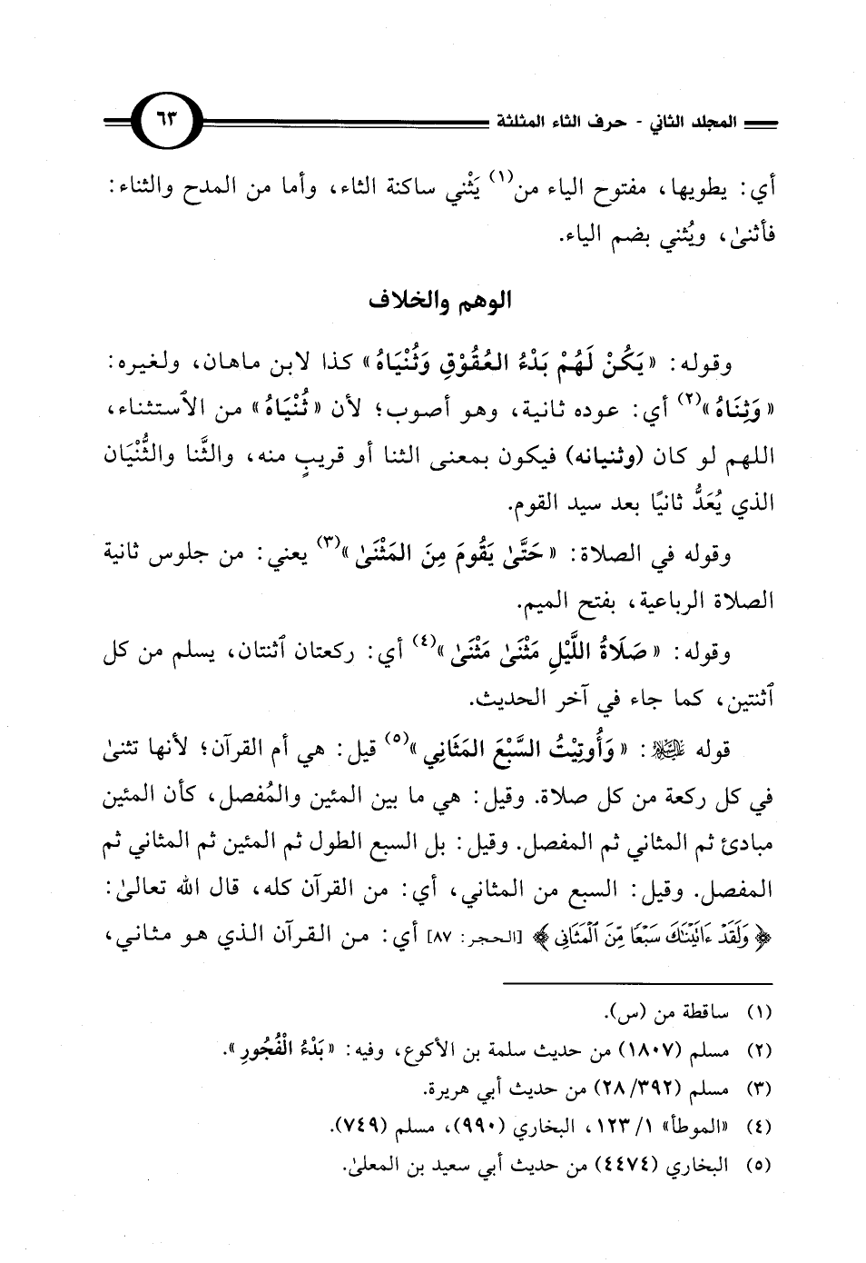 وقوله في الصلاة: "حَتَّى يَقُومَ مِنَ المَثْنَى" (¬3) يعني: من جلوس ثانية الصلاة الرباعية، بفتح الميم.