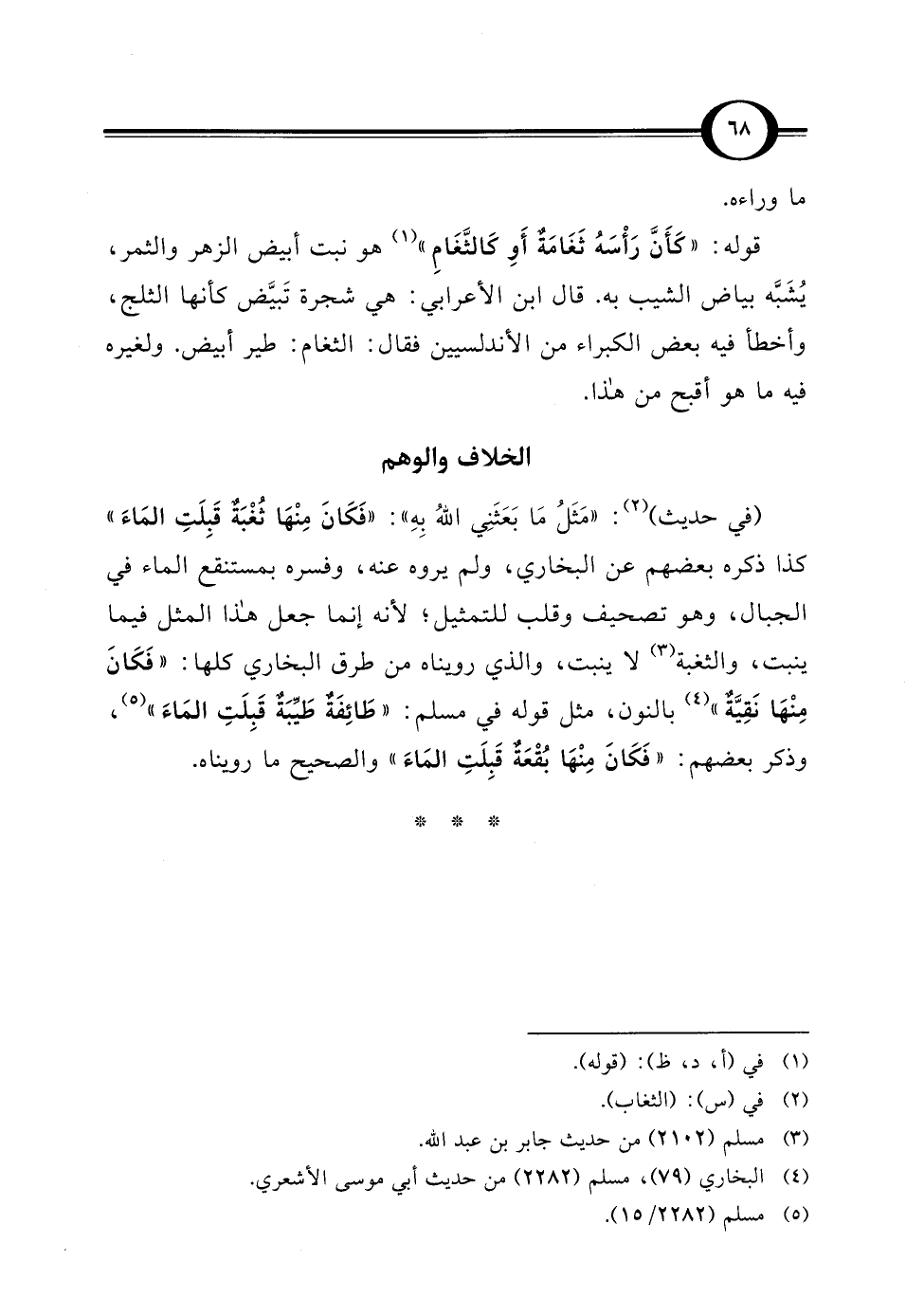 (في حديث) (¬2): "مَثَلُ مَا بَعَثَنِي اللهُ بِهِ": "فَكَانَ مِنْهَا ثُغْبَةٌ قَبِلَتِ المَاءَ" كذا ذكره بعضهم عن البخاري، ولم يروه عنه، وفسره بمستنقع الماء في الجبال، وهو تصحيف وقلب للتمثيل؛ لأنه إنما جعل هذا المثل فيما ينبت، والثغبة (¬3) لا ينبت، والذي رويناه من طرق البخاري كلها: "فَكَانَ مِنْهَا نَقِيَّةٌ" (¬4) بالنون، مثل قوله في مسلم: "طَائِفَةٌ طَيِّبَةٌ قَبِلَتِ المَاءَ" (¬5)، وذكر بعضهم: "فَكَانَ مِنْهَا بُقْعَة قَبِلَتِ المَاءَ" والصحيح ما رويناه.