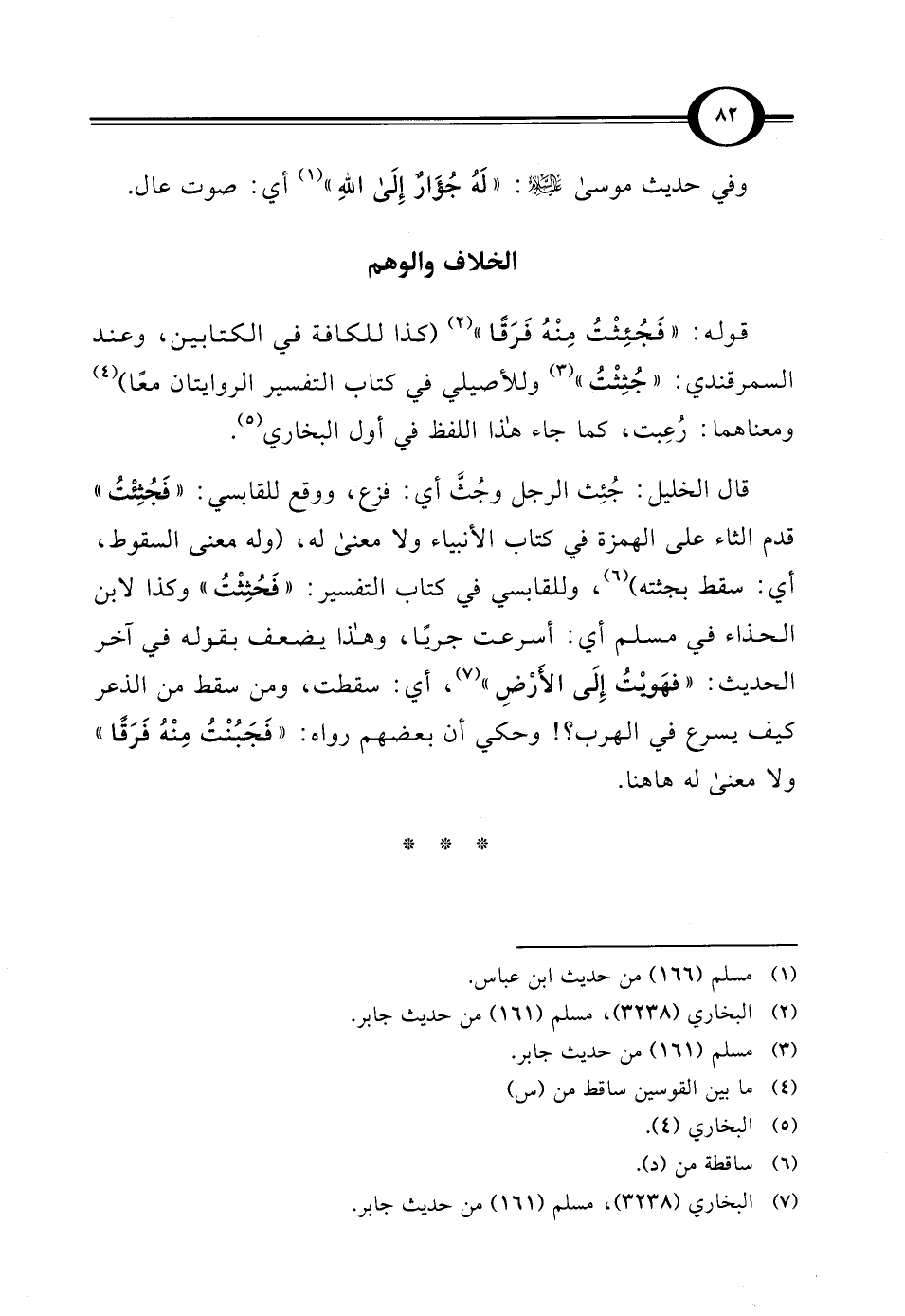 قال الخليل: جُئِث الرجل وجُثَّ أي: فزع، ووقع للقابسي: "فَجُثِئْتُ" قدم الثاء على الهمزة في كتاب الأنبياء ولا معنى له، (وله معنى السقوط، أي: سقط بجثته) (¬6)، وللقابسي في كتاب التفسير: "فَحُثِثْتُ" وكذا لابن الحذاء في مسلم أي: أسرعت جريًا، وهذا يضعف بقوله في آخر الحديث: "فهَويْتُ إِلَى الأَرْضِ" (¬7)، أي: سقطت، ومن سقط من الذعر كيف يسرع في الهرب؟! وحكي أن بعضهم رواه: "فَجَبُنْتُ مِنْهُ فَرَقًا" ولا معنى له هاهنا.