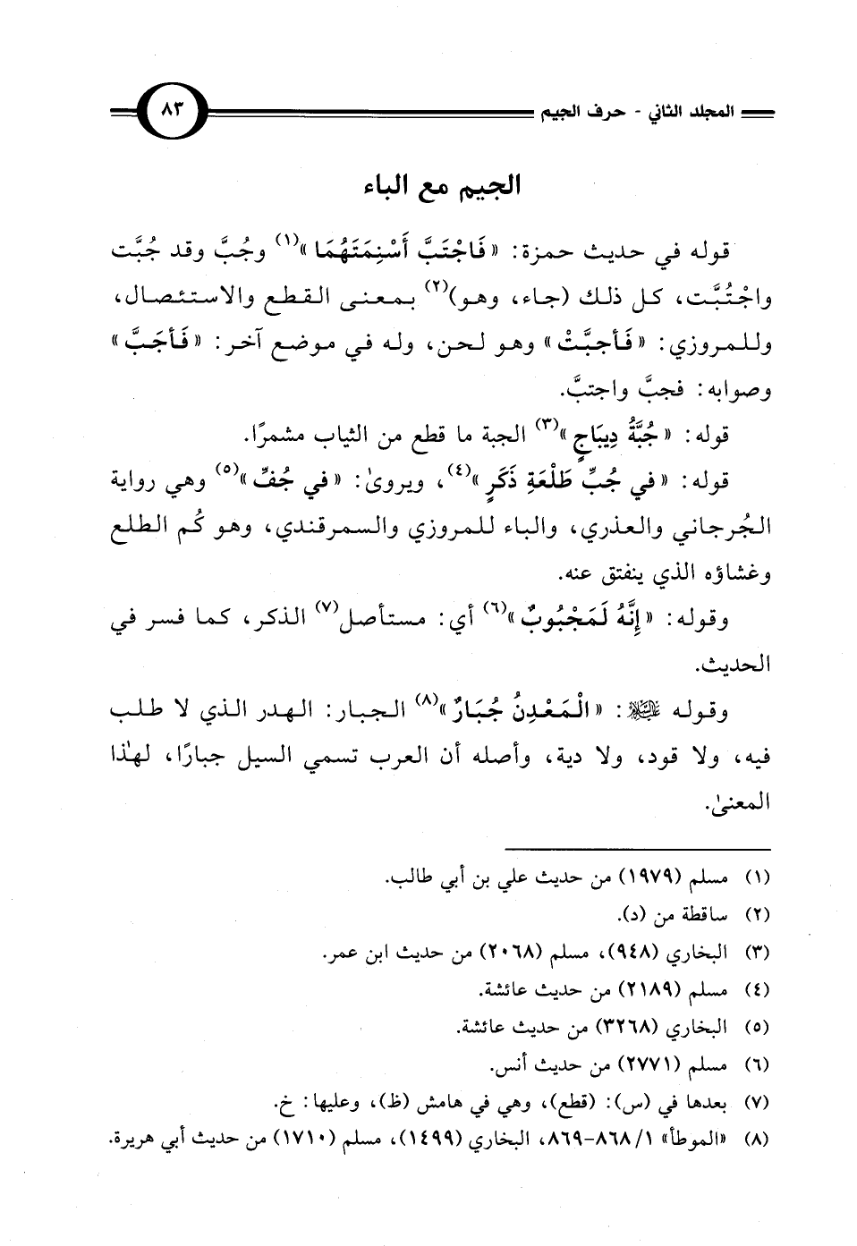 قوله في حديث حمزة: "فَاجْتَبَّ أَسْنِمَتَهُمَا" (¬1) وجُبَّ وقد جُبَّت واجْتُبَّت، كل ذلك (جاء، وهو) (¬2) بمعنى القطع والاستئصال، وللمروزي: "فَأجبَّتْ" وهو لحن، وله في موضع آخر: "فَأجَبَّ" وصوابه: فجبَّ واجتبَّ.