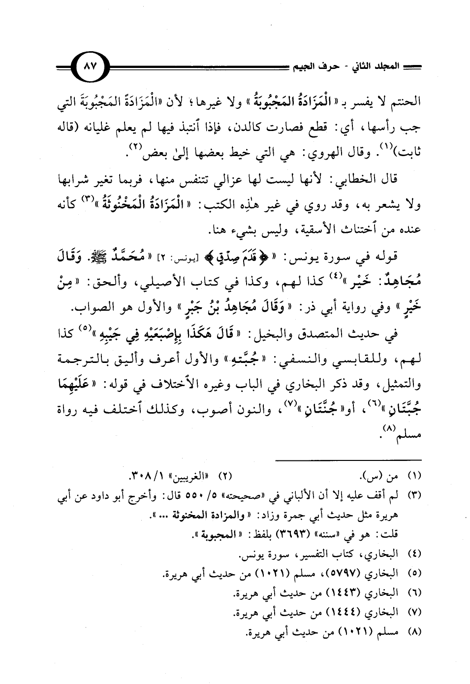 (¬3) لم أقف عليه إلا أن الألباني في "صحيحته" 5/ 550 قال: وأخرج أبو داود عن أبي هريرة مثل حديث أبي جمرة وزاد: "والمزادة المخنوثة ... ". قلت: هو في "سننه" (3693) بلفظ: "المجبوبة".