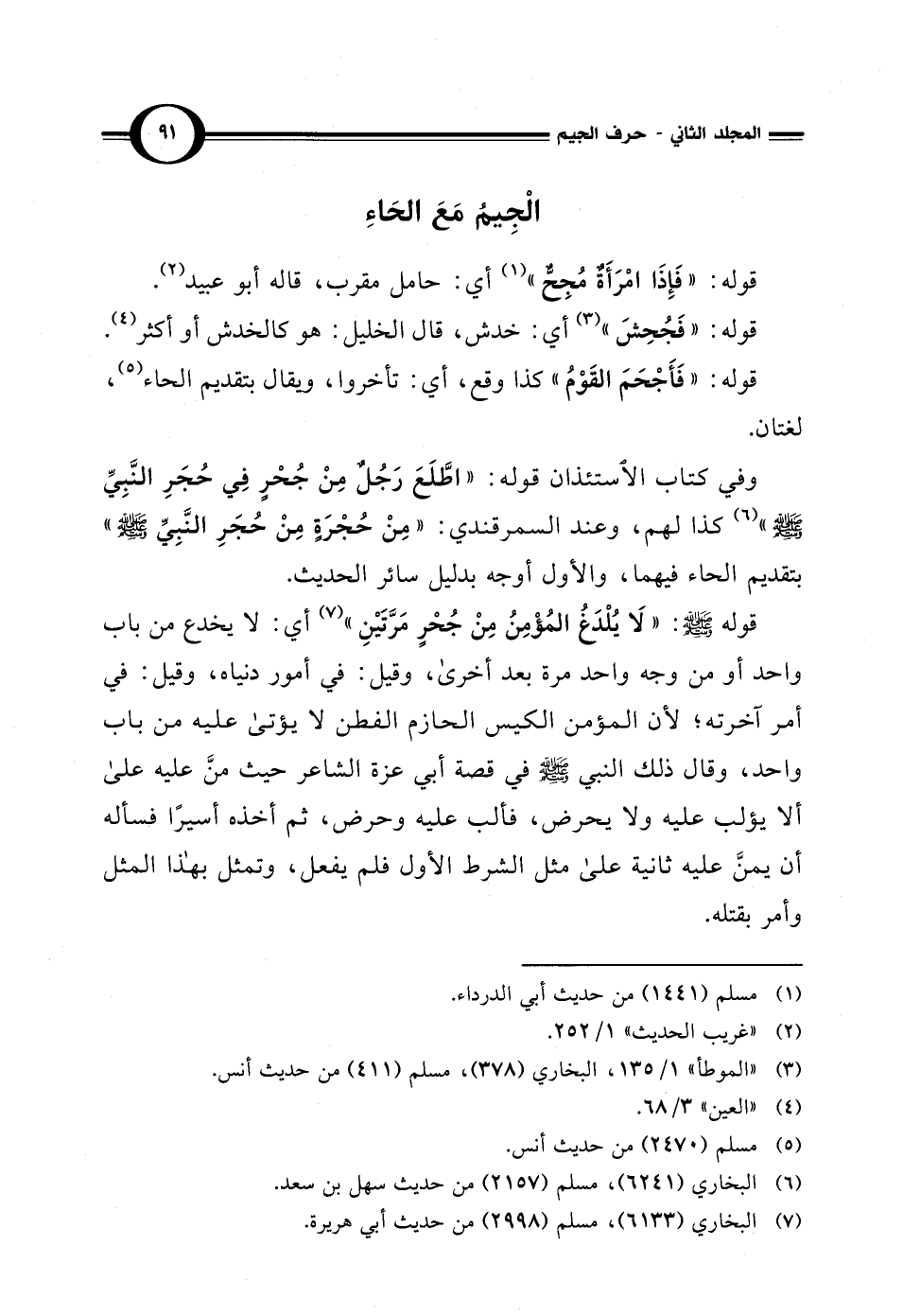 قوله - صلى الله عليه وسلم -: "لَا يُلْدَغ المُؤْمِنُ مِنْ جُحْرٍ مَرَّتَيْنِ" (¬7) أي: لا يخدع من باب واحد أو من وجه واحد مرة بعد أخرى، وقيل: في أمور دنياه، وقيل: في أمر آخرته؛ لأن المؤمن الكيس الحازم الفطن لا يؤتى عليه من باب واحد، وقال ذلك النبي - صلى الله عليه وسلم - في قصة أبي عزة الشاعر حيث منَّ عليه على ألا يؤلب عليه ولا يحرض، فألب عليه وحرض، ثم أخذه أسيرًا فسأله أن يمنَّ عليه ثانية على مثل الشرط الأول فلم يفعل، وتمثل بهذا المثل وأمر بقتله.