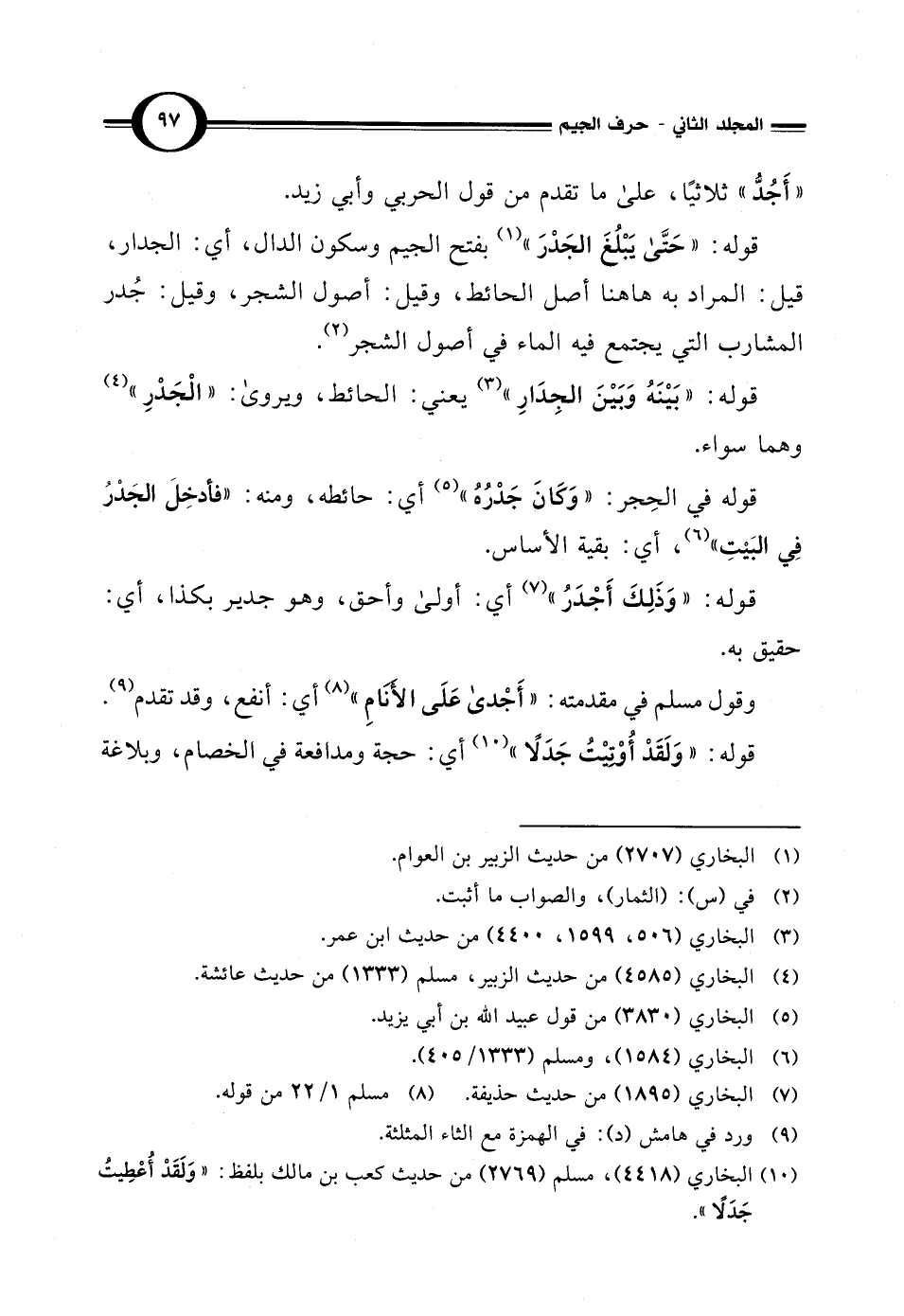 قوله: "حَتَّى يَبْلُغَ الجَدْرَ" (¬1) بفتح الجيم وسكون الدال، أي: الجدار، قيل: المراد به هاهنا أصل الحائط، وقيل: أصول الشجر، وقيل: جُدر المشارب التي يجتمع فيه الماء في أصول الشجر (¬2).
